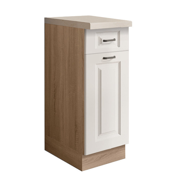 Praktická jednodvéřová dolní skříňka se zásuvkou je vyrobena z laminované dřevotřísky v barevném provedení korpus dub sonoma, dvířka frézované bílá mat PVC. Díky polici uvnitř skříně získáte praktický úložný prostor. Výhodou systému Favorit je možnost libovolného sestavení skříněk a díky tomu můžete tvořit vybrané kompozice a přizpůsobit je vlastním interiérům. Dolní skříňky jsou bez pracovní desky a soklu. Zboží dodáváme v demontu.