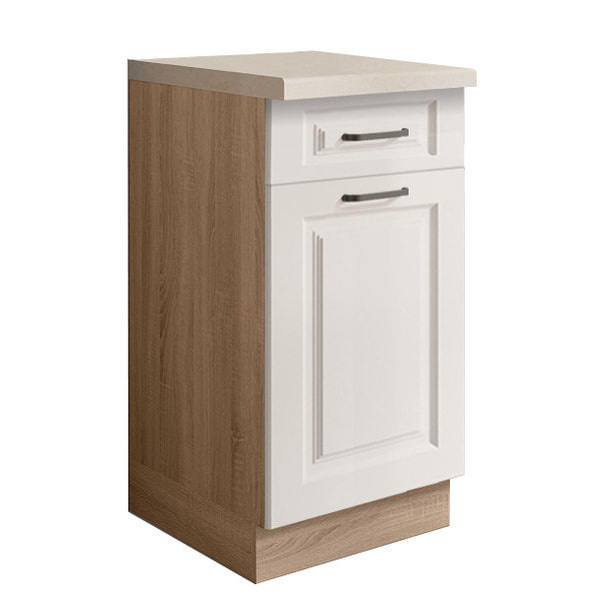Praktická jednodvéřová dolní skříňka se zásuvkou je vyrobena z laminované dřevotřísky v barevném provedení korpus dub sonoma , dvířka bílá lesk. Díky polici uvnitř skříně získáte praktický úložný prostor. Skříně s tichým dovíráním v zásuvkách a dvířkách. Výhodou systému Favorit je možnost libovolného sestavení skříněk a díky tomu můžete tvořit vybrané kompozice a přizpůsobit je vlastním interiérům. Dolní skříňky jsou bez pracovní desky a soklu. Zboží dodáváme v demontu.