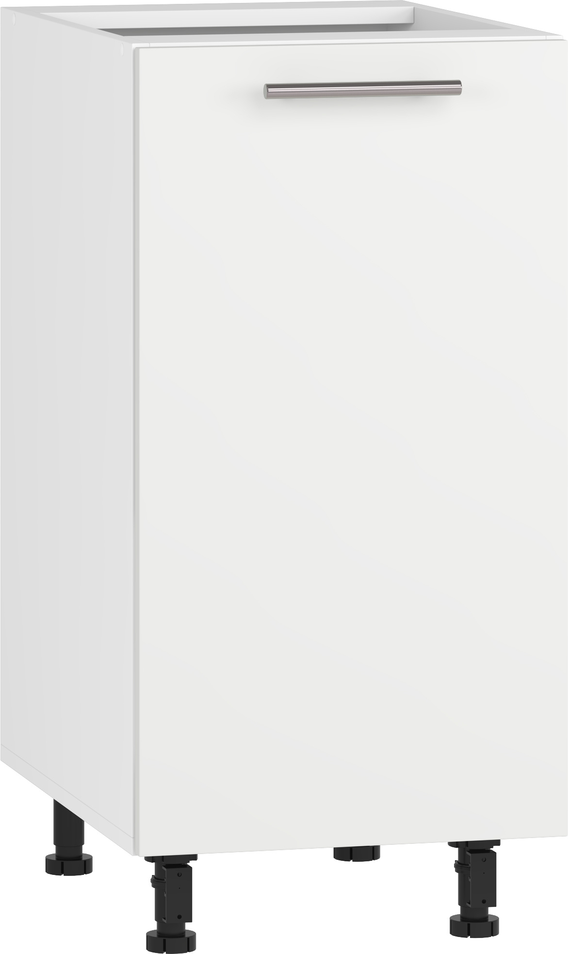 Dolní skříňka je součástí moderní kuchyňské linky VENTO. Tato skříňka je s dvířky. Korpus je z lamina v barvě bílá, dvířka jsou z materiálu MDF v barvě bílý mat. Dolní skříňka má regulované nožky. Výška skříněk je bez pracovní desky. Úchytka je v barvě chrom o délce 12,8 cm. Zboží je dodáváno v demontu.