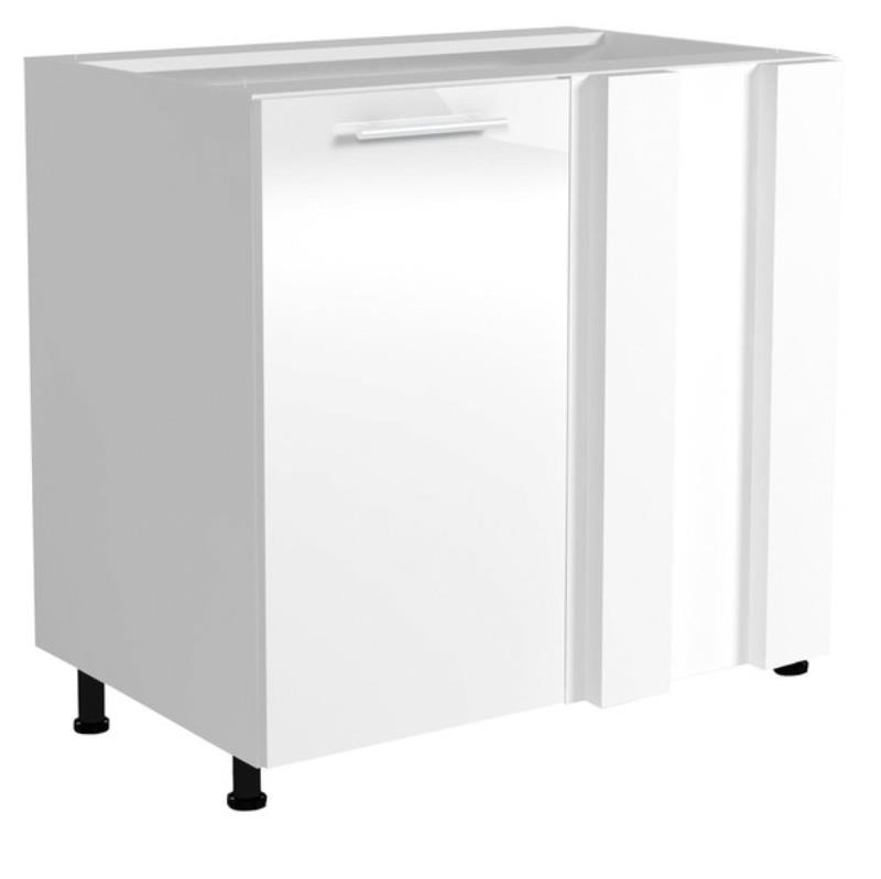 Dolní skříňka rohová je součástí moderní kuchyňské linky VENTO. Tato skříňka je s dvířky. Korpus je z lamina v barvě bílá, dvířka jsou z materiálu MDF v barvě bílý lesk. Dolní skříňka má regulované nožky. Výška skříněk je bez pracovní desky. Úchytka je v barvě chrom o délce 12,8 cm. Zboží je dodáváno v demontu.