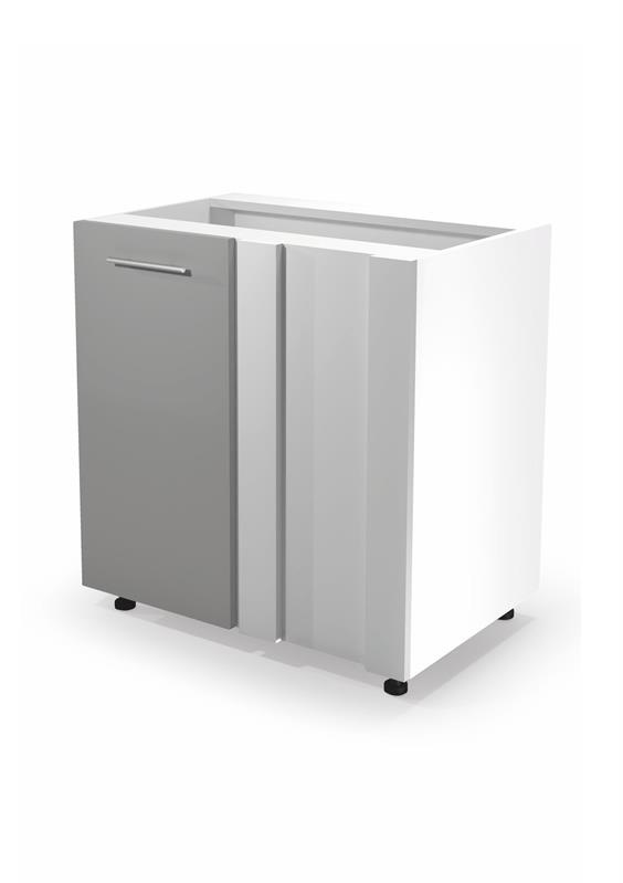Dolní skříňka rohová je součástí moderní kuchyňské linky VENTO. Tato skříňka je s dvířky. Korpus je z lamina v barvě bílá, dvířka jsou z materiálu MDF v barvě šedý lesk. Dolní skříňka má regulované nožky. Výška skříněk je bez pracovní desky. Úchytka je v barvě chrom o délce 12,8 cm. Zboží je dodáváno v demontu.