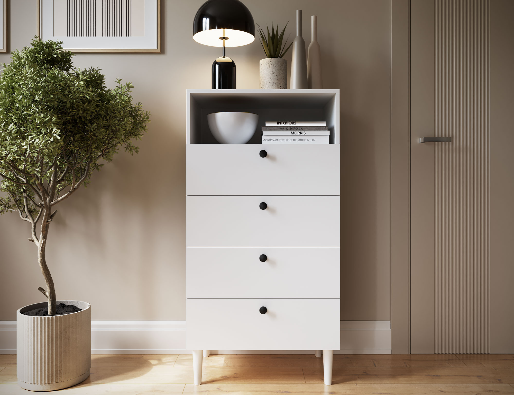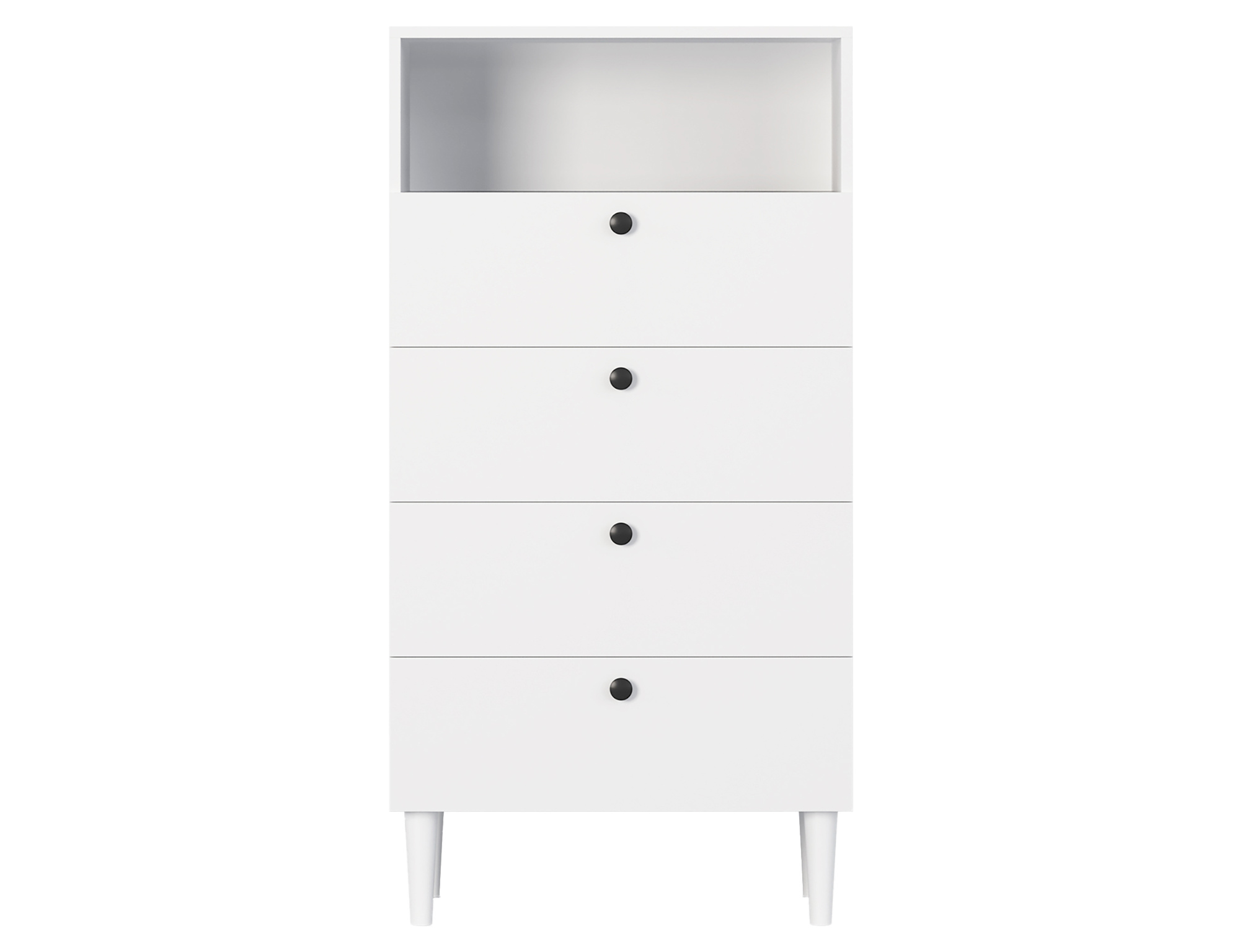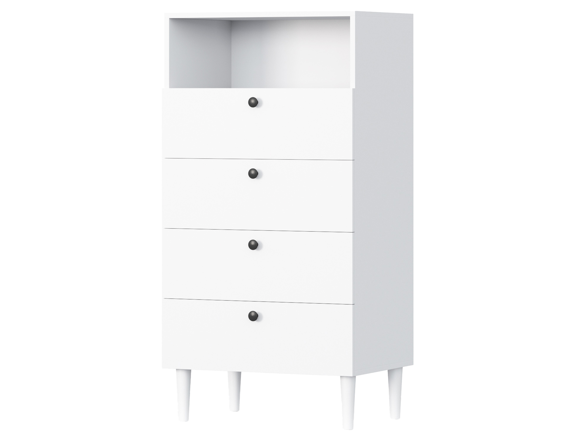 The Dullum shelf unit is a stylish and practical piece of furniture with dimensions of 40 cm in depth, 60 cm in width, and 115 cm in height. It features one open shelf and four drawers, providing ample storage space for various items. The unit stands on wooden legs that are 15 cm high, giving it a light and elegant appearance. Each drawer has a maximum load capacity of 3 kg, making the furniture both functional and solidly stable.