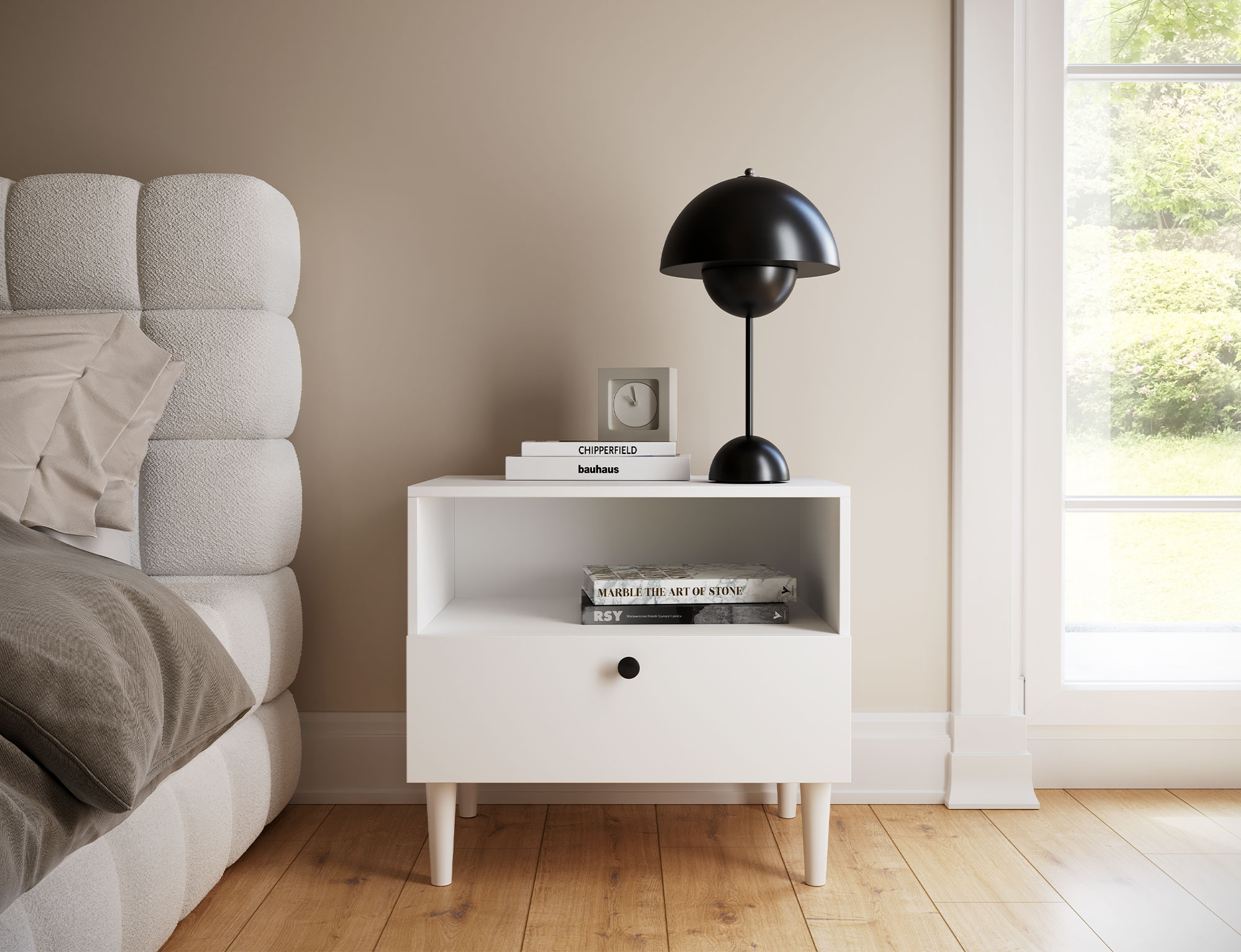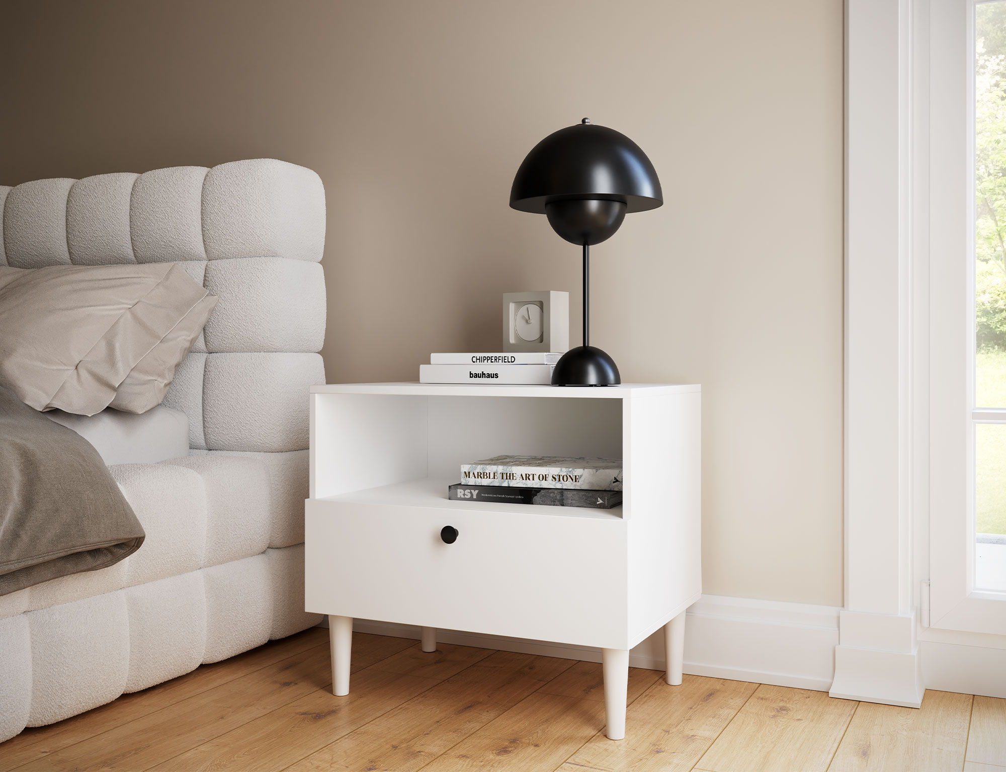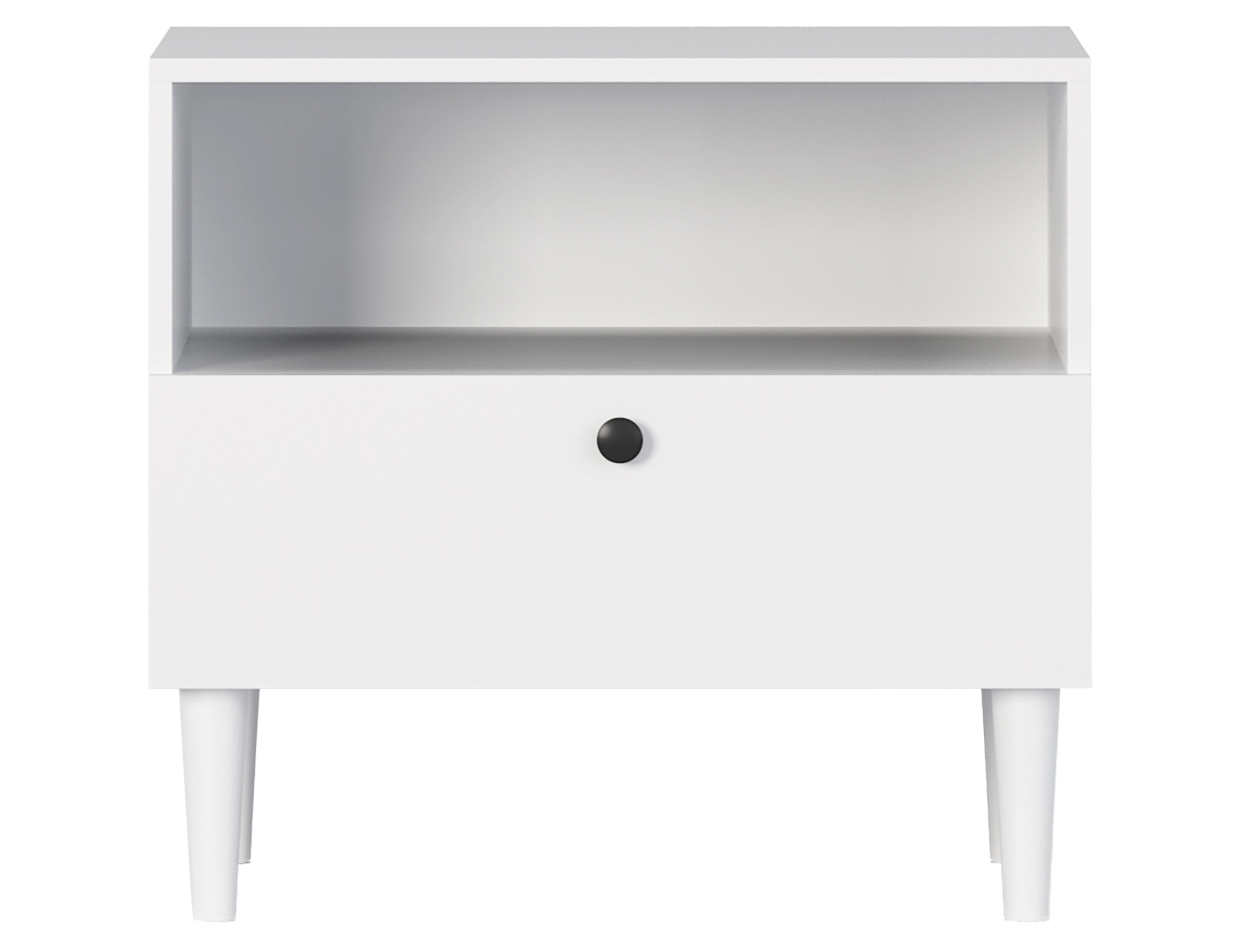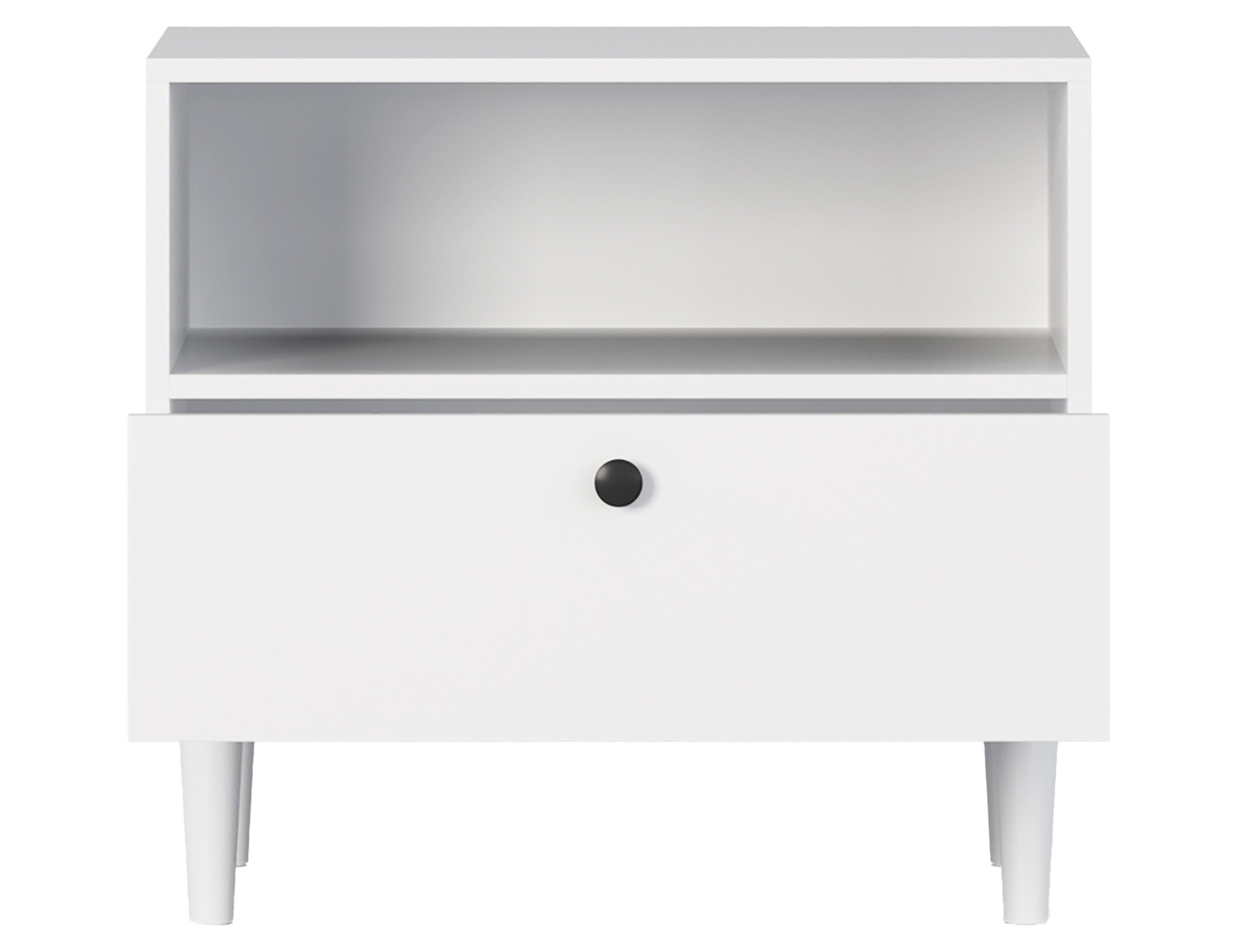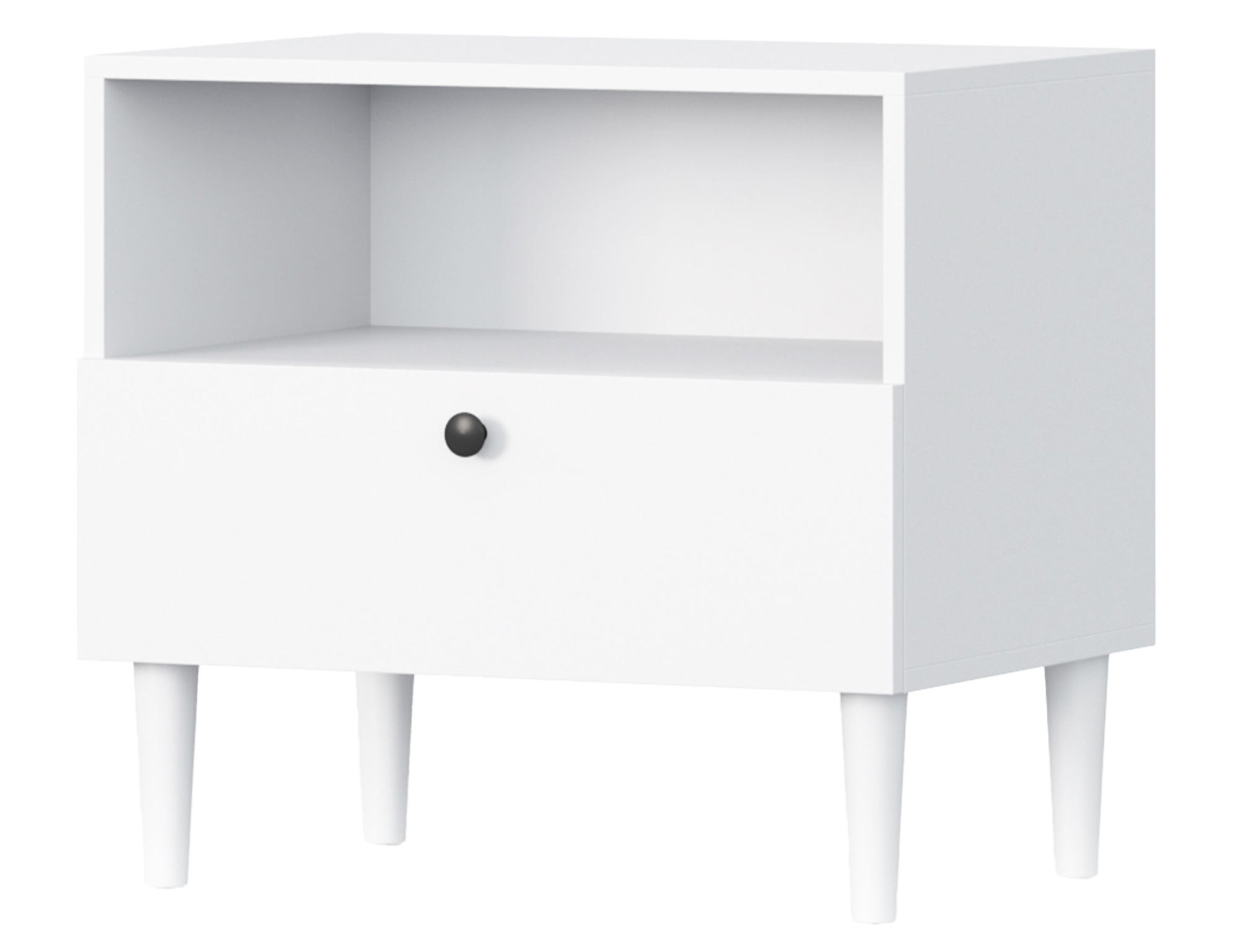 The Dullum nightstand is a functional and stylish piece of furniture with dimensions of 60 cm in width, 55 cm in height, and 40 cm in depth. It features one open shelf and one drawer, providing practical storage space for essential items. Its elegant design ensures it fits seamlessly into any interior, adding a touch of modern character.