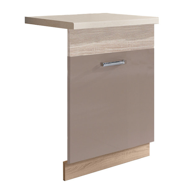 Přední část pro myčku ze sestavy PREMIO je vyrobena z laminované dřevotřísky v barevném provedení dub sonoma/cappuccino lesk. Dolní skříňky jsou bez pracovní desky a soklu.