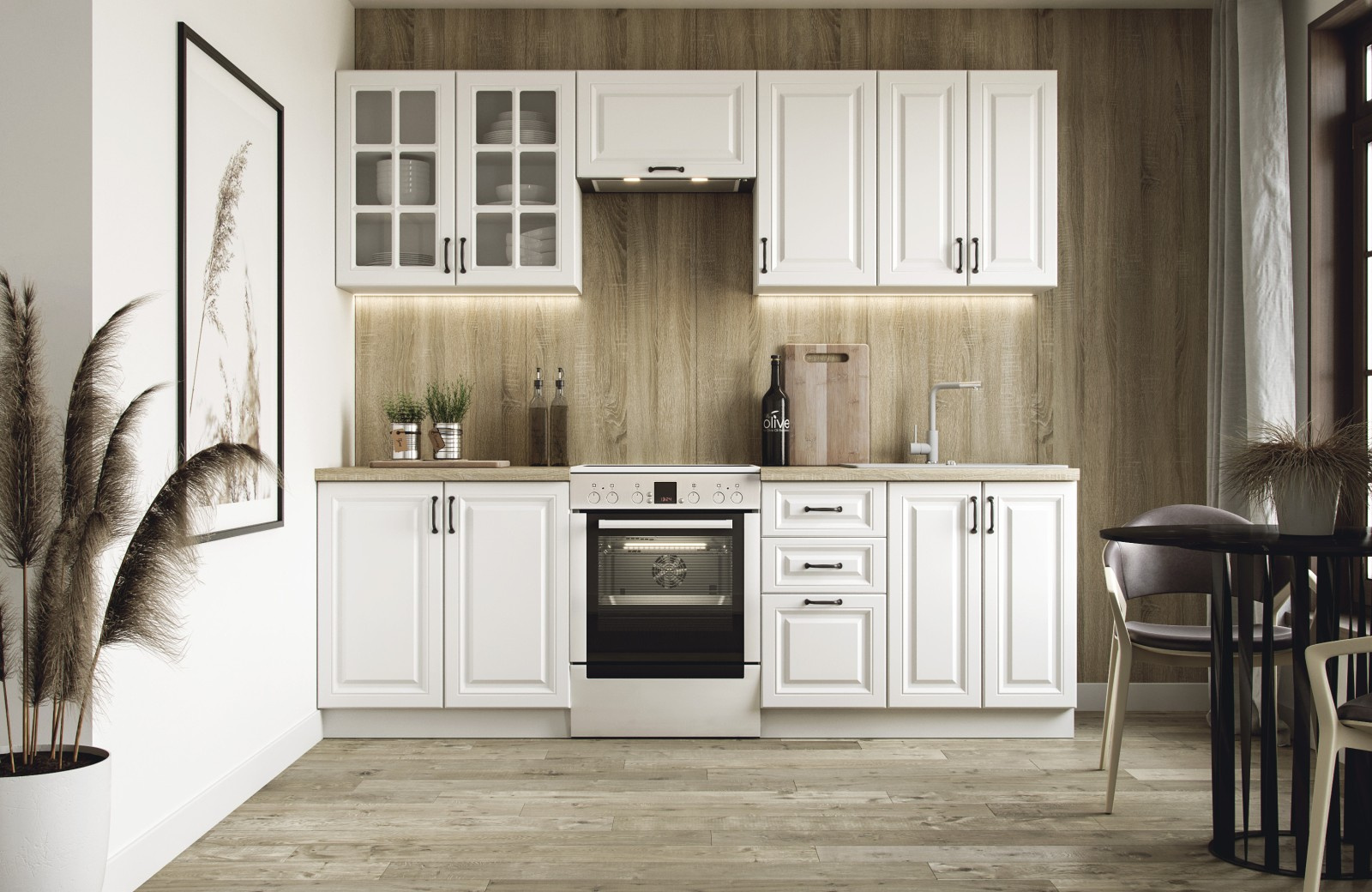 - horní skříňka 80 cm - vitrína, horní skříňka 60 cm - s dvířky, horní skříńka 40 cm - s dvířky, horní skříňka 60 cm - na digestoř
