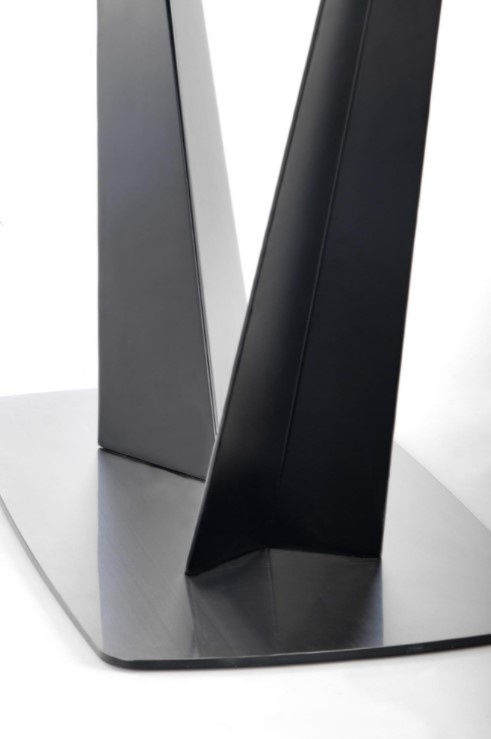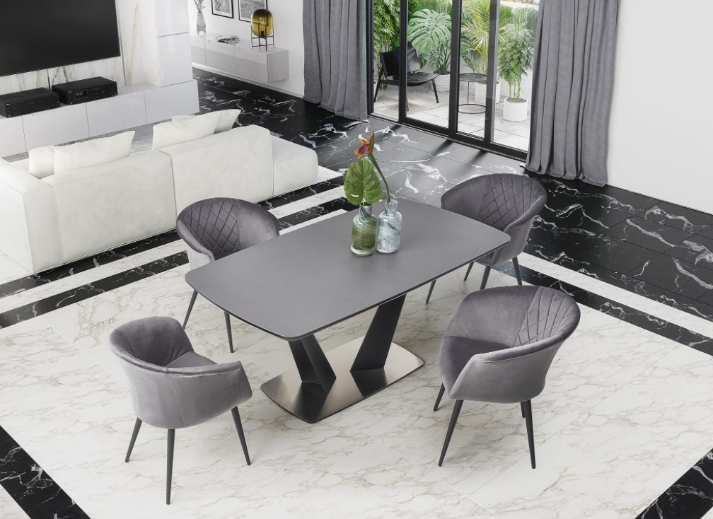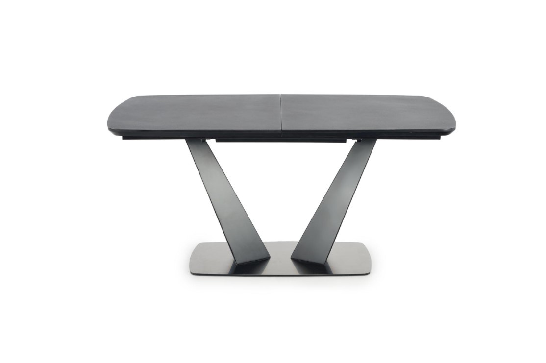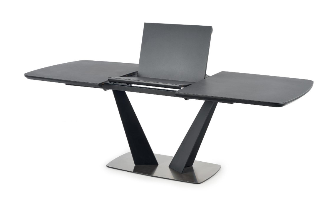 Elegantní rozkládací jídelní stůl. Deska jídelního stolu v obdélníkovém tvaru je v kombinaci provedení MDF lakované a skla v barvě tmavě šedé. Horní desku je možno rozložit až do 220 cm. Atypická noha je černá ocel malovaná práškovaná v kombinaci s nerezovou ocelí. Zboží dodáváme v demontu.