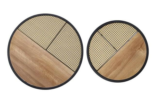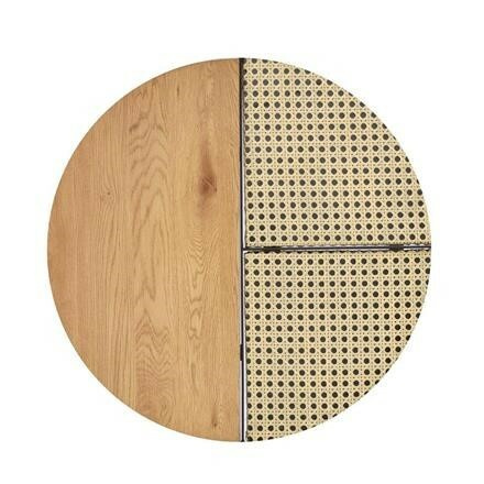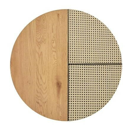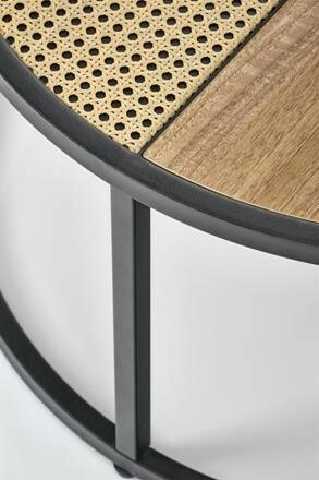 Konfereční stolky mají stolovou desku vyrobenou v kombinaci MDF v dekoru dub zlatý a propletení z umělého ratanu. Konstrukce se třemi nohami je práškově lakované oceli v černé barvě. Zboží dodáváme v demontu.