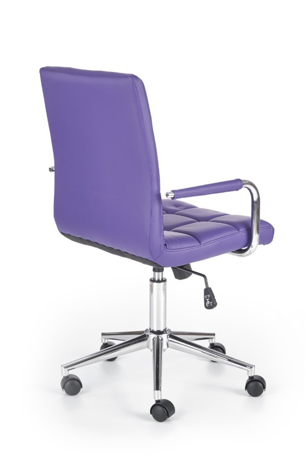 Dětská židle Gonzo je elegantní a praktická židle s mechanikou TILT z čalouněné eko kůže v dezénu fialová. Výšku židle můžete nastavit podle potřeb páčkou, která je umístěná pod sedákem. Židle má komfortní výhodu, která představuje područky, jejichž zásluhou si vaše dítě dopřeje ještě více pohodlí. Konstrukce židle je tvořená chromovaným kovem a její součást je tvořena základnou s pěti-ramenným křížem s kolečkami, která zajišťují snadnou mobilitu židle. Šroub nacházející se pod sedákem umožňuje houpání a blokaci v poloze vertikální. Maximální nosnost je 90kg. Zboží je dodáváno v demontu.