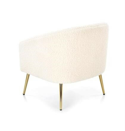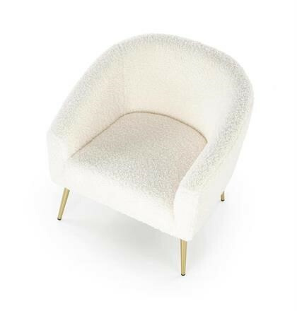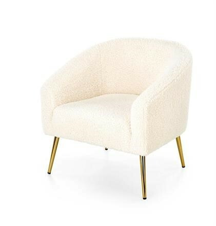 Křeslo Grifon je nápadné především potahem z buklé tkaniny v krémovém provedení, kterou je potažené celé křeslo včetně područek. Tkanina připomíná ovčí srst a je příjemná na dotek. Nohy křesla jsou z chromované oceli ve zlatém provedení. Maximální nostnost 100 kg. Zboží dodáváme v demontu.