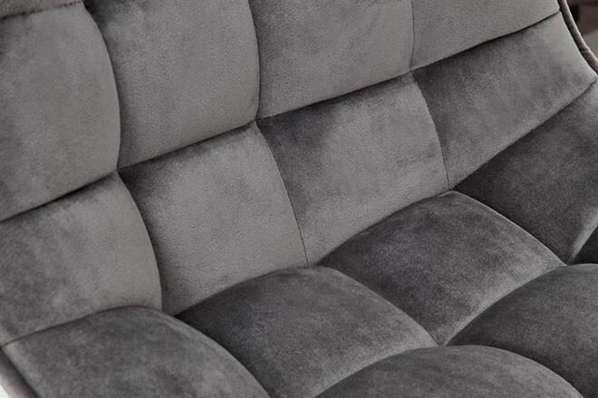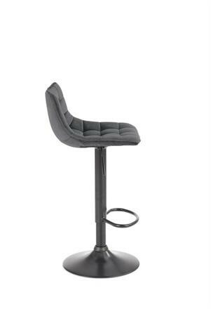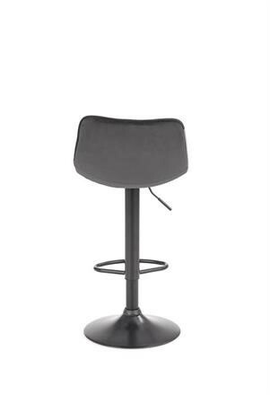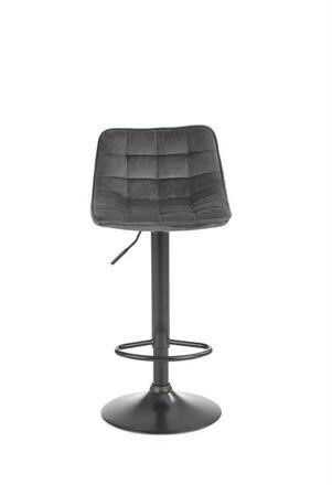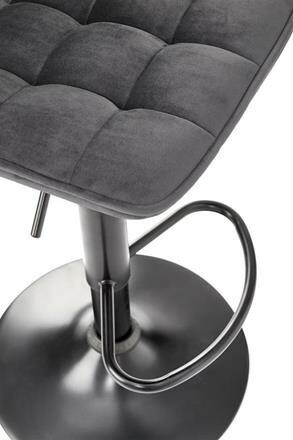 Moderní barová židle s centrální nohou a s kruhovou podnoží z černé práškované oceli s příčkou pod nohy. Židle je otočná a výškově nastavitelná. Čalounění z šedého sametu. Zboží dodáváme v demontu.