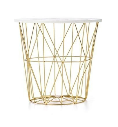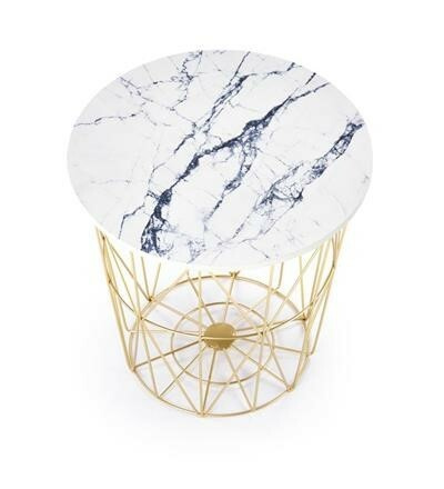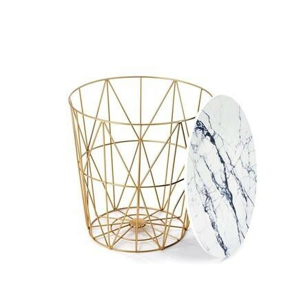 Deska stolu (resp. víko) je z dýhovaného MDF v zajímavém dezénu bílého mramoru. Poradí si až s 10 kg zátěže. Podnož má pak podobu drátěného koše ze zlaté práškované ocele. Tento prostor využijete např. k uložení přikrývek nebo dekorativních předmětů. Zboží dodáváme v demontu
