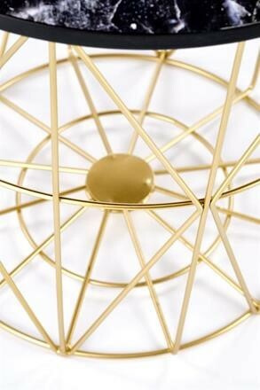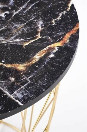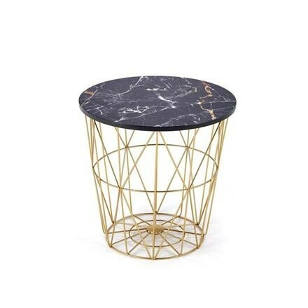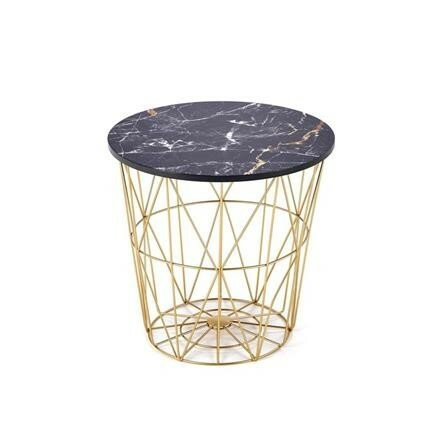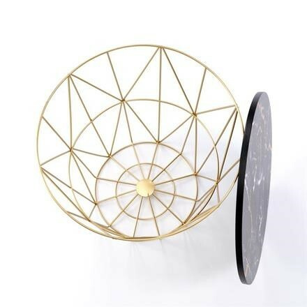 Deska stolu (resp. víko) je z dýhovaného MDF v zajímavém dezénu černého mramoru. Poradí si až s 10 kg zátěže. Podnož má pak podobu drátěného koše ze zlaté práškované ocele. Tento prostor využijete např. k uložení přikrývek nebo dekorativních předmětů. Zboží dodáváme v demontu