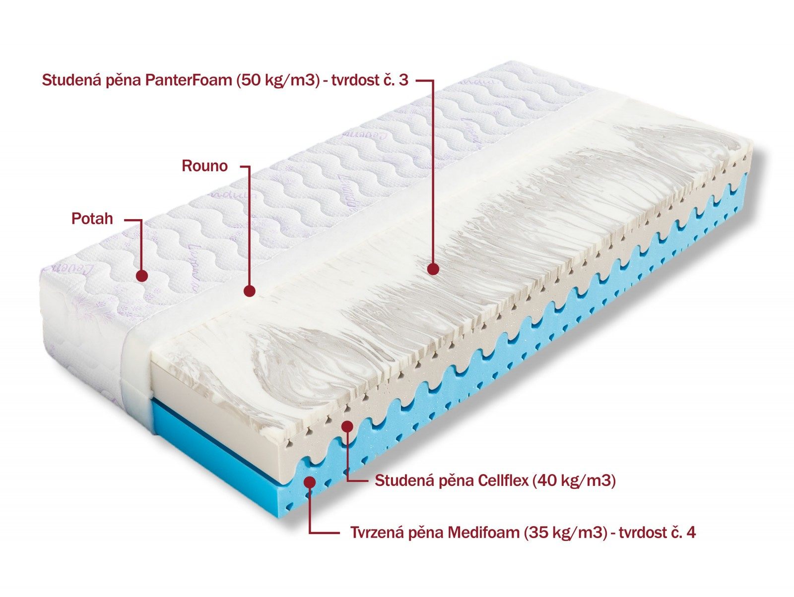 Pevnější matrace se špičkovou studenou pěnou Cellflex, která je díky vysoké hustotě (40 kg/m3) velmi odolná a zaručí dlouhou životnost Vaší matrace. Její zářezy v exponovaných místech přispívají k dokonalé opoře ležícího těla (pod rameny a boky se více prohne a odpruží). Pěna Cellflex je doplněna poddajnější studenou pěnou PanterFoam, která je velmi vzdušná a elastická, proto tvoří měkčí stranu této matrace (tvrdost č. 3). Naproti tomu pevnější strana (tvrdost č. 4) je tvořena vysoce gramážní pěnou MediFoam, která i při vyšší hustotě optimalizuje rozložení tlaku na matraci. I na jejím povrchu najdete speciální zářezy. Jádro matrace je provzdušněné vlnkovitým prořezem důležitým pro větší prodyšnost matrace a dokonalou spolupráci obou pěn.