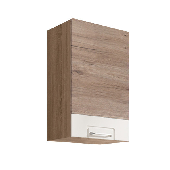 Jednodvéřová horní skříňka vč. police je vyrobena z laminované dřevotřísky v barevném provedení: korpus dub sonoma, dvířka san remo/bílá PVC. Dovírání v zásuvkách i dveřích je s funkcí tichého dovírání. Zboží dodáváme v demontu.
