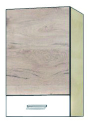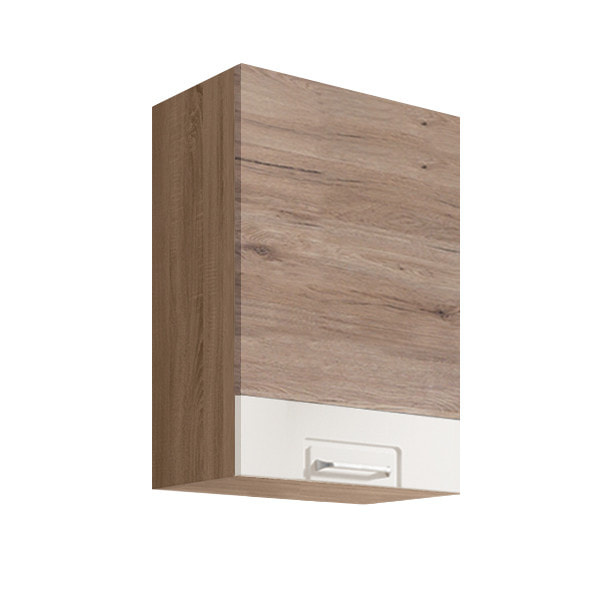 Jednodvéřová horní skříňka vč. police je vyrobena z laminované dřevotřísky v barevném provedení: korpus dub sonoma, dvířka san remo/bílá PVC. Dovírání v zásuvkách i dveřích je s funkcí tichého dovírání. Zboží dodáváme v demontu.
