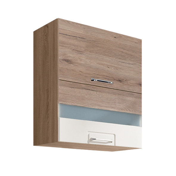 Dvoudvéřová horní skříňka se zabudovaným sklem je vyrobena z laminované dřevotřísky v barevném provedení: korpus dub sonoma, dvířka san remo/bílá PVC. Dovírání v zásuvkách i dveřích je s funkcí tichého dovírání. Zboží dodáváme v demontu.