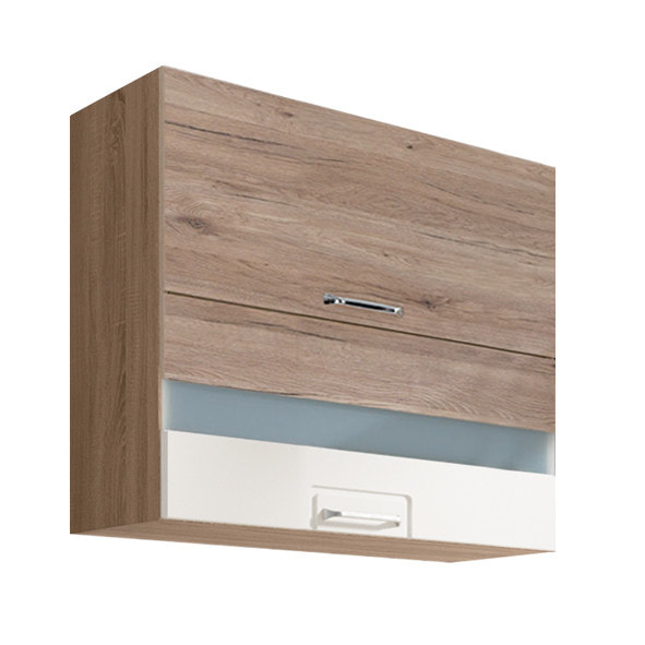 Dvoudvéřová horní skříňka se zabudovaným sklem je vyrobena z laminované dřevotřísky v barevném provedení: korpus dub sonoma, dvířka san remo/bílá PVC. Dovírání v zásuvkách i dveřích je s funkcí tichého dovírání. Zboží dodáváme v demontu.