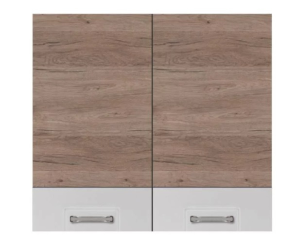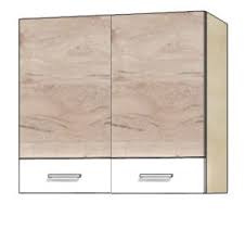 Dvoudvéřová horní skříňka s policemi je vyrobena z laminované dřevotřísky v barevném provedení: korpus dub sonoma, dvířka san remo/bílá PVC. Dovírání v zásuvkách i dveřích je s funkcí tichého dovírání. Zboží dodáváme v demontu.