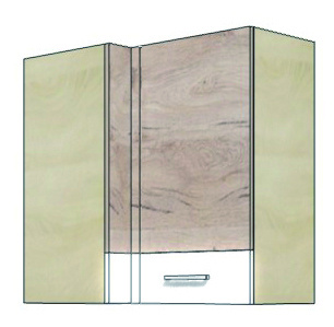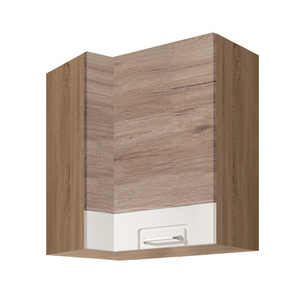 Rohová horní skříňka s policí je vyrobena z laminované dřevotřísky v barevném provedení: korpus dub sonoma, dvířka san remo/bílá PVC. Dovírání v zásuvkách i dveřích je s funkcí tichého dovírání. Zboží dodáváme v demontu.
