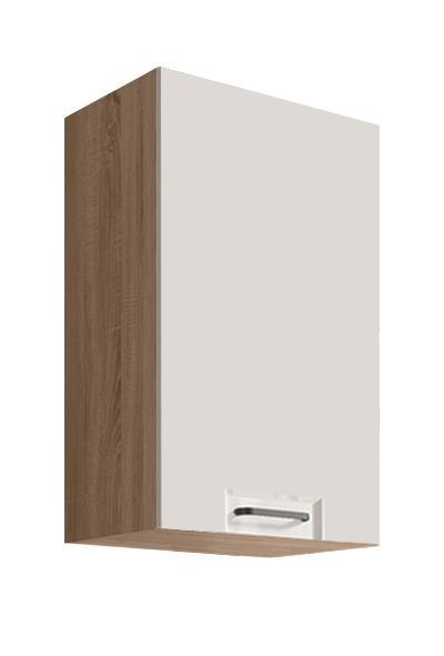Klasická závěsná jednodveřová skříňka, se dvěma policemi, s plnými dvířky je vyrobena z laminované dřevotřísky v barevném provedení korpus dub sonoma, dvířka bílá lesk. Skříně s tichým dovíráním v zásuvkách a dvířkách. Výhodou systému Favorit je možnost libovolného sestavení skříněk a díky tomu můžete tvořit vybrané kompozice a přizpůsobit je vlastním interiérům. Zboží dodáváme v demontu.