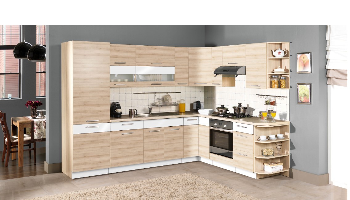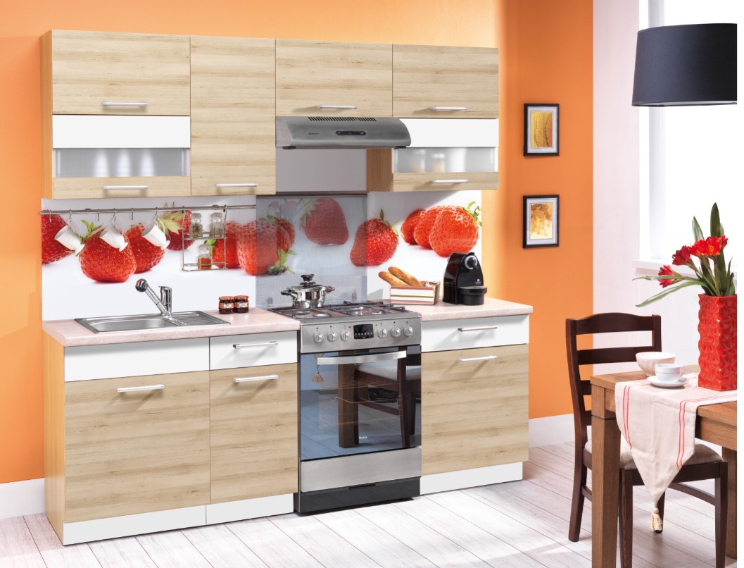 Horní skříňka digestořová Modena s výklopnými dvířky a mezistěnou je vyrobená z kvalitní dřevotřísky (16 mm) s ABS hranou 2 mm v barvě korpusu - rijeka světlá. Dezén dvířek lze vybrat z nabídky. Kovové pojezdy METALBOX v zásuvkách, regulovatelné ve třech úrovních. Tato skříňka je součástí kuchyně Modena, která se dá sestavit dle vašeho přání. Zboží dodáváme v demontu.