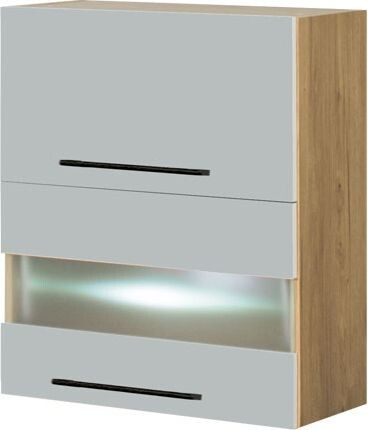 Horní skříňka je vyrobena z lamina v provedení korpus lamino dub soma tmavý o tl. 16mm, dvířka MDF šedá a mléčné sklo. Skříňka včetně LED osvětlení. Ve skříňkách je použito kování s tichým dojezdem. Skříňky obsahují kompletní kování, úchytky a návod k sestavení. Zboží dodáváme v demontu.