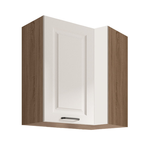 Rohová závěsná jednodveřová skříňka, s policí, s plnými dvířky je vyrobena z laminované dřevotřísky v barevném provedení korpus dub sonoma, dvířka bílá lesk. Skříně s tichým dovíráním v zásuvkách a dvířkách. Výhodou systému Smart je možnost libovolného sestavení skříněk a díky tomu můžete tvořit vybrané kompozice a přizpůsobit je vlastním interiérům. Zboží dodáváme v demontu.