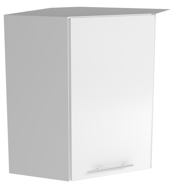 Horní skříňka rohová je součástí moderní kuchyňské linky VENTO. Korpus je z lamina v barvě bílá, dvířka jsou z materiálu MDF v barvě šedý lesk. Úchytka v barvě chrom o délce 12,8 cm. Zboží je dodáváno v demontu.