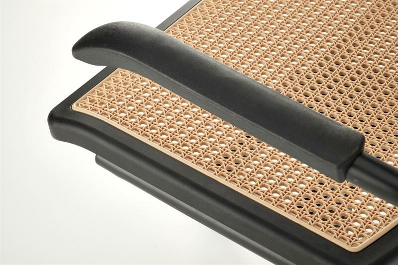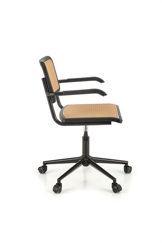 Kancelářská židle je vyrobená z polypropylenu v černo přírodním provedení. Sedák a opěradlo je vyplněný imitací umělého ratanu v přírodním dezénu. Stojí na černé kovové podnoži s plastovými kolečky a nastavitelnou výškou sedu. Maximální nosnost je 100 kg. Zboží dodáváme v demontu.