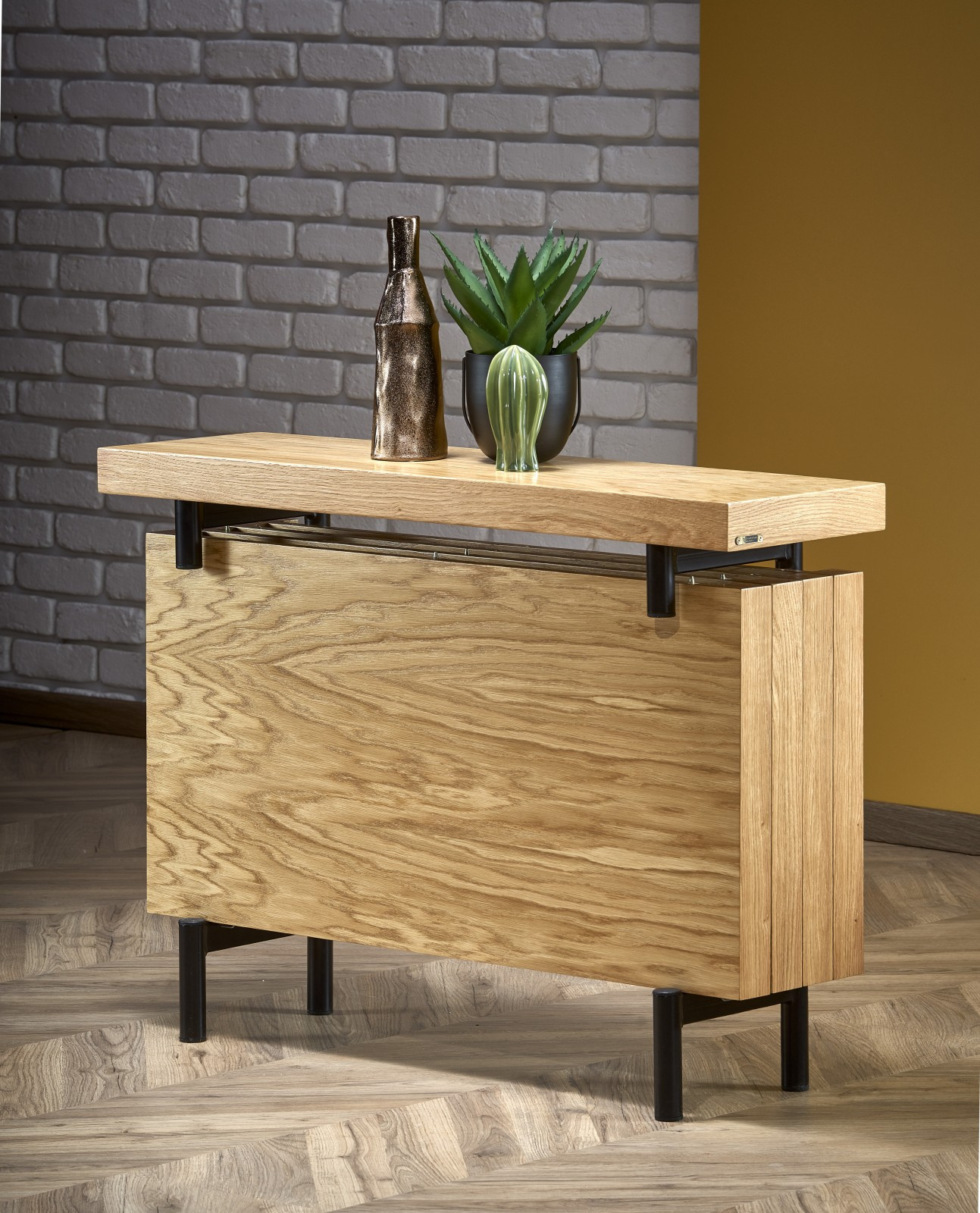 Tento odkládací stolek je vyroben z dýhované MDF desky a práškované oceli v kombinaci barev dub přírodní a černá. Zboží je dodáváno v demontu.