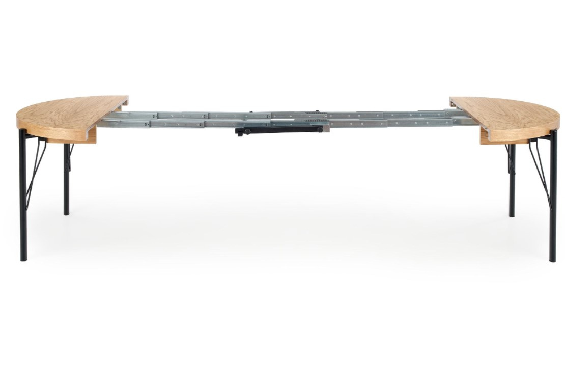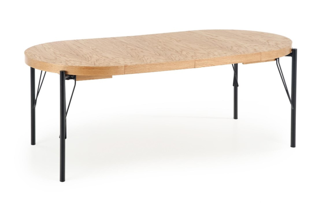 Moderní rozkládací jídelní stůl je vyroben z kvalitní MDF dýhované v dezénu dub přírodní, nohy černé z práškované oceli. Osvěžte svůj interiér tímto jídelním stolem. Židle nejsou součástí produktu. Zboží dodáváme v demontu.