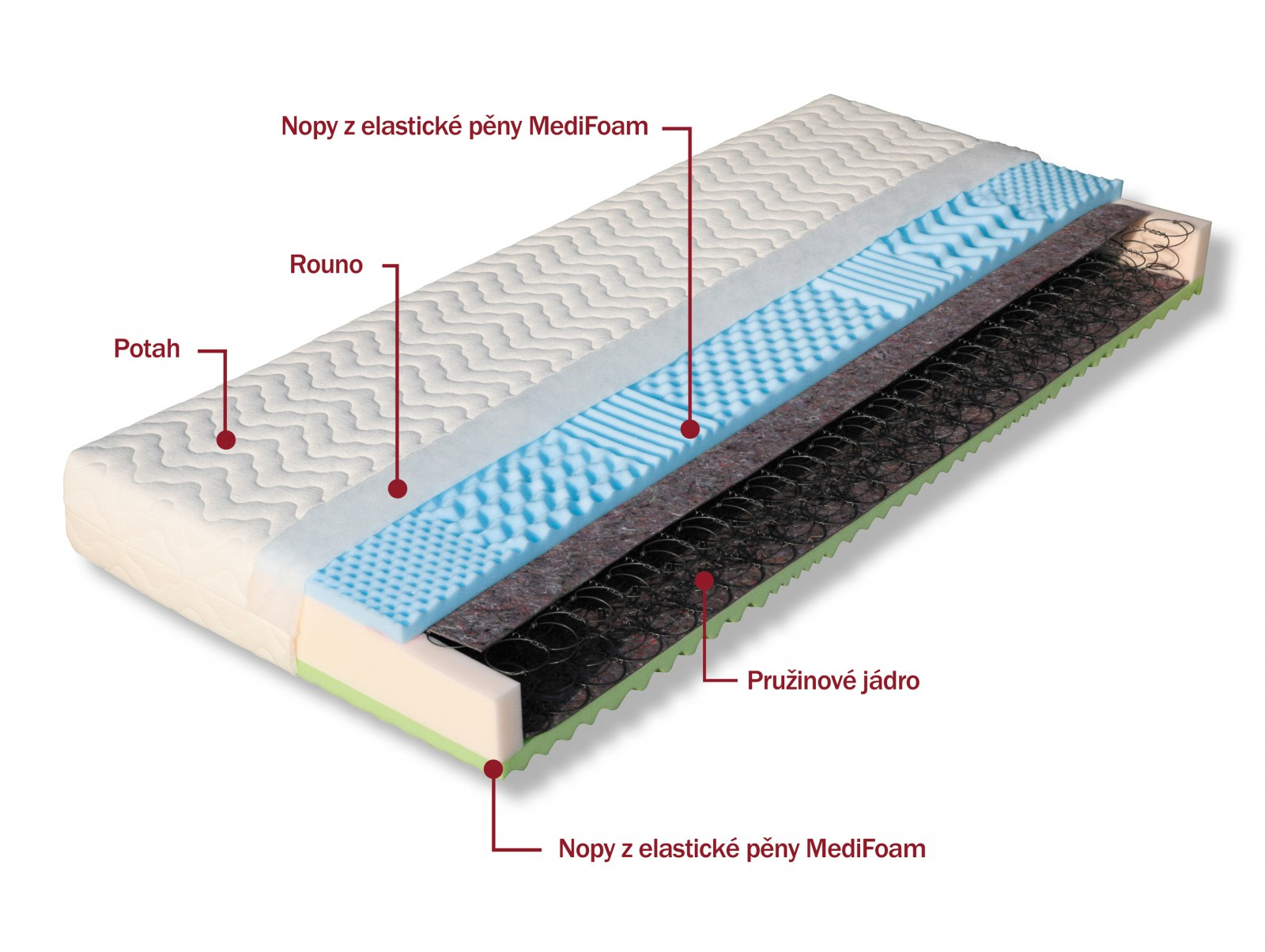 Kvalitní pružinová sedmizónová matrace. Nosné vrstvy matrace tvoří elastická pěna MediFoam střední tuhosti tvarovaná do masážních nopů. Použití nopů u matrace je velmi prospěšné pro prokrvení pokožky a uvolnění svalstva v průběhu spánku. Tato matrace je vhodná pro širokou škálu uživatelů. Matrace lze vybrat v potahu ÚPLET nebo ALOE VERA. V objednávce prosím uveďte Vámi vybraný potah.Výška matrace včetně potahu 20 cm. Matrace do hmotnosti 120 kg.