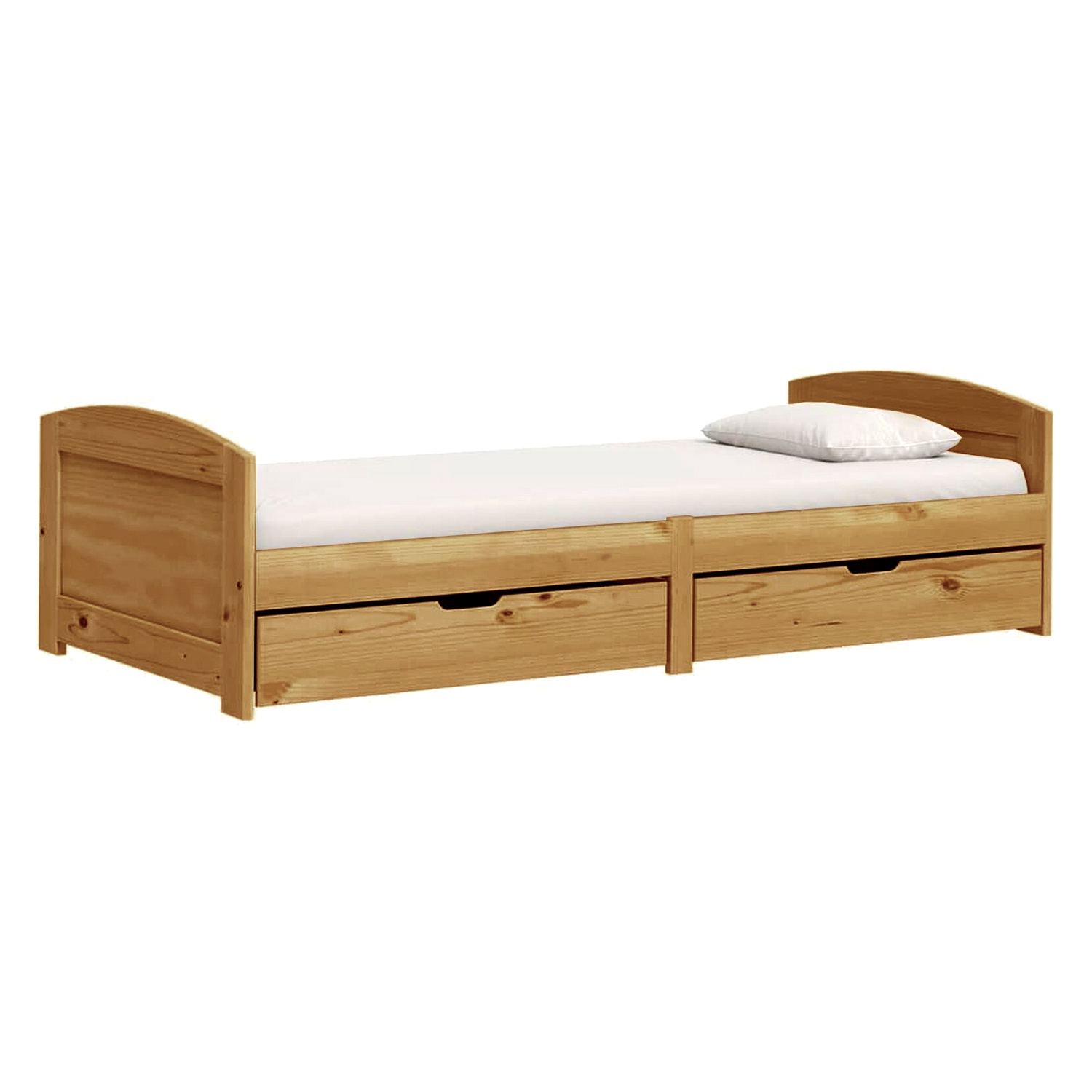 materiál masiv borovice, voskované provedení 2 zásuvky pojízdné na kolečkách jsou v ceně cena včetně roštu (dřevěný laťkový) bez matrace doporučený rozměr matrace 90 × 200 cm