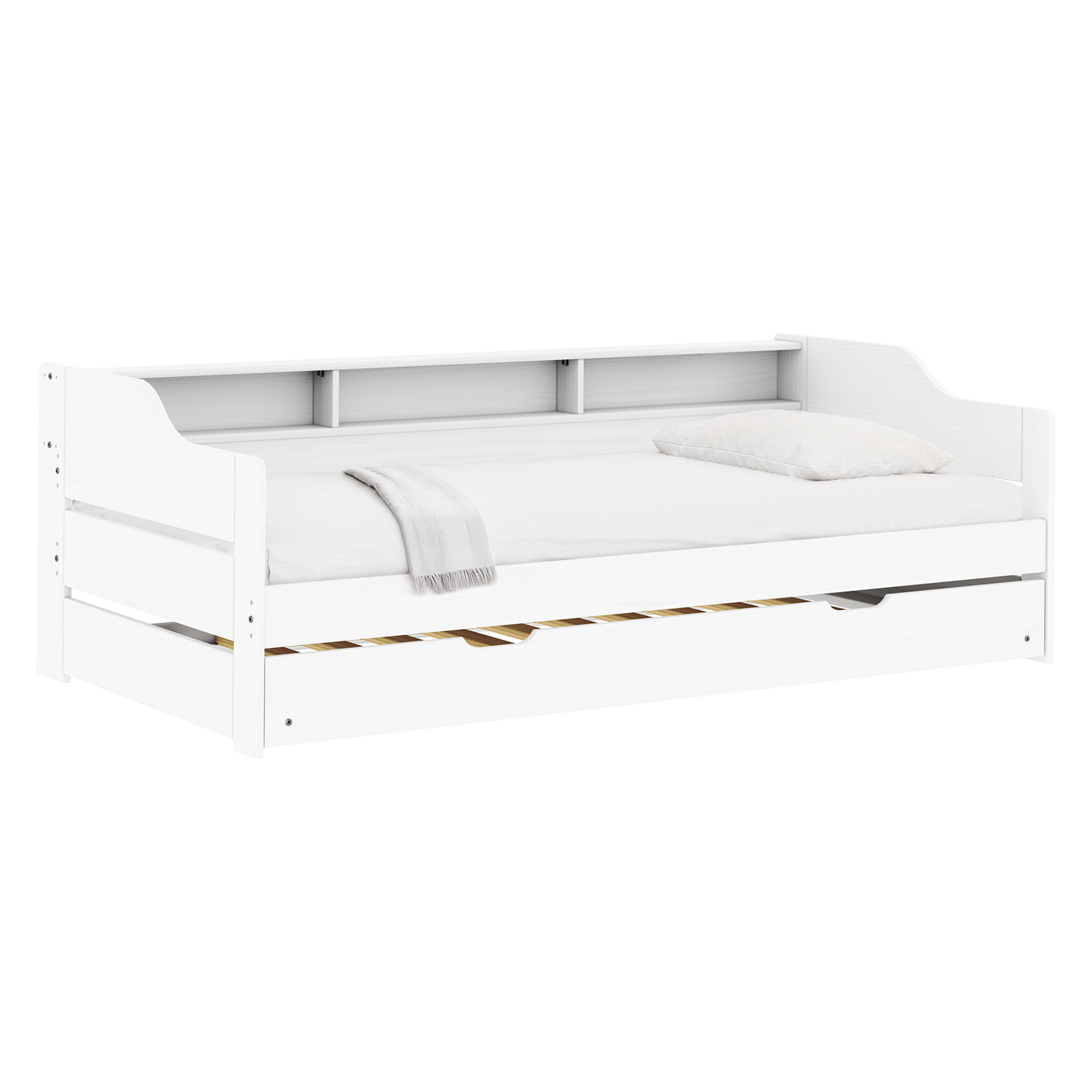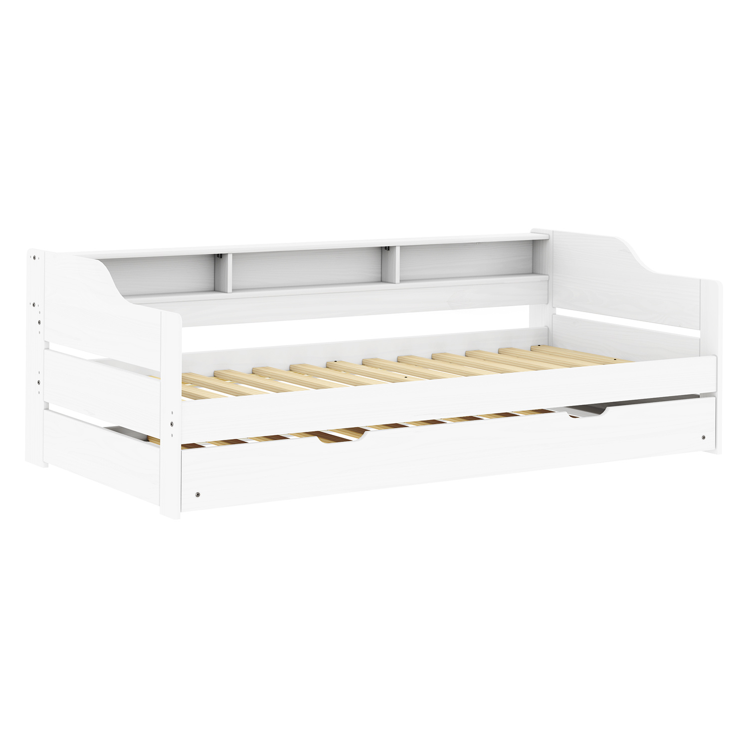 materiál masiv borovice, barevné provedení bílý lak v zadní části otevřená police, v dolní části výsuvná přistýlka cena včetně roštů (dřevěné laťkové), matrace nejsou v ceně doporučený rozměr matrací 90 × 200 cm