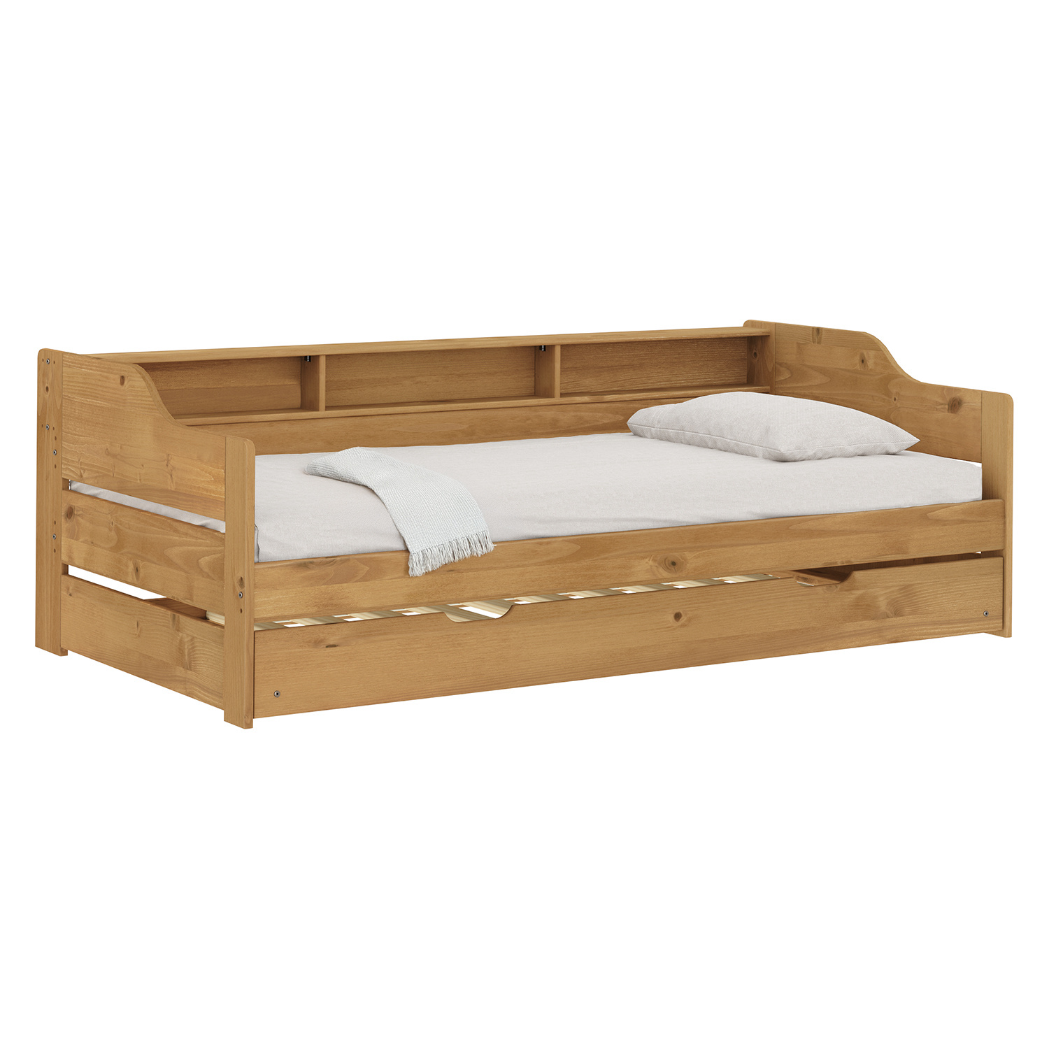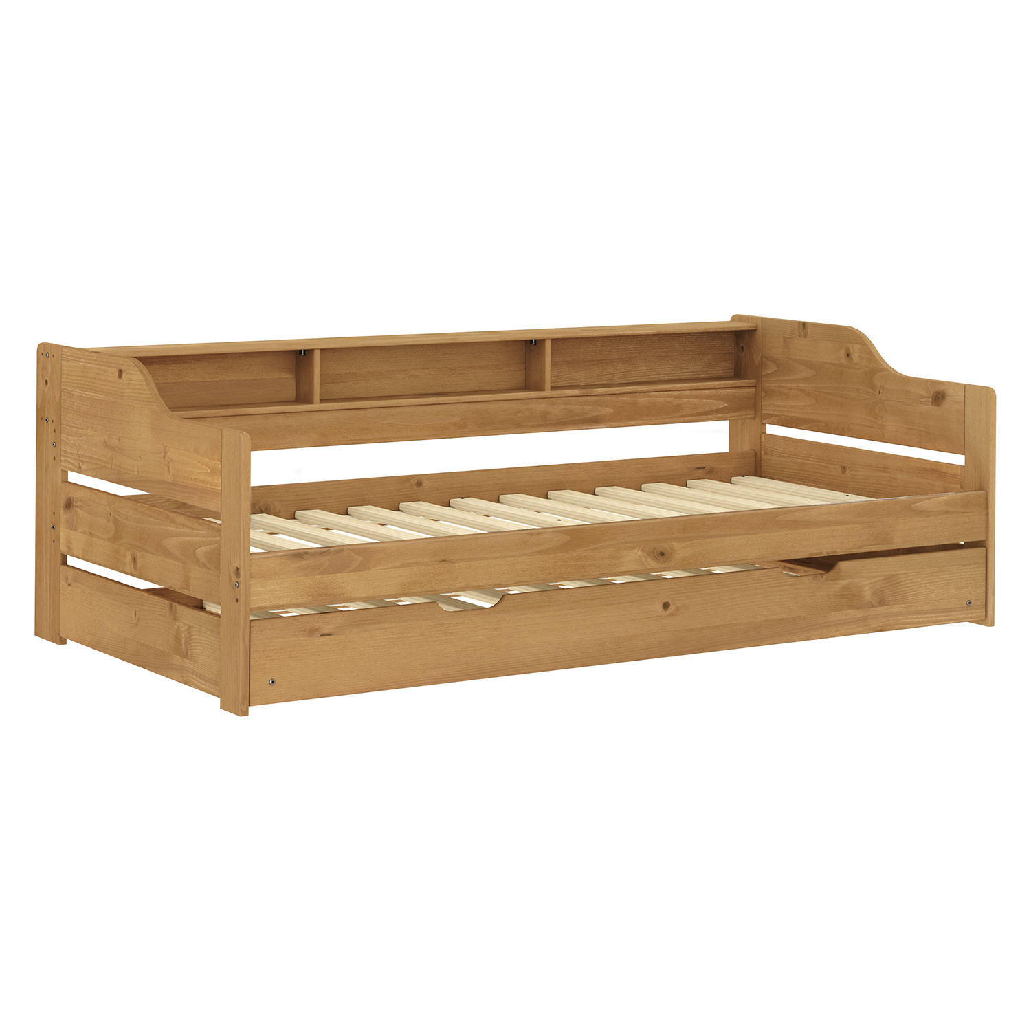 materiál masiv borovice, voskované provedení v zadní části otevřená police, v dolní části výsuvná přistýlka cena včetně roštů (dřevěné laťkové), matrace nejsou v ceně doporučený rozměr matrací 90 × 200 cm