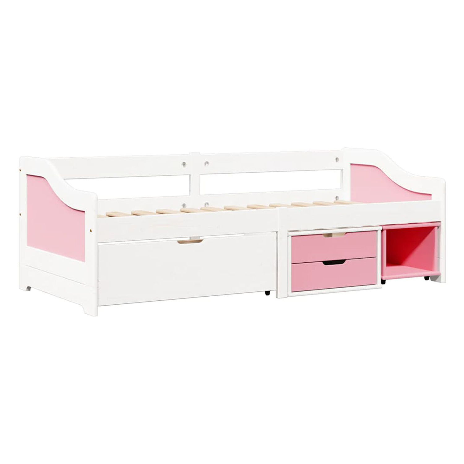 materiál masiv borovice, barevné provedení bílý / růžový lak praktické úložné prostory pod postelí (zásuvky a otevřená police) v ceně cena včetně roštu (dřevěný laťkový), matrace není v ceně doporučený rozměr matrace 90 × 200 cm