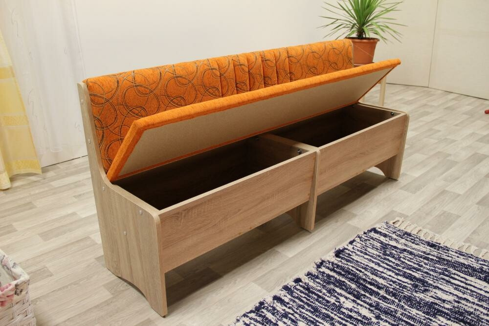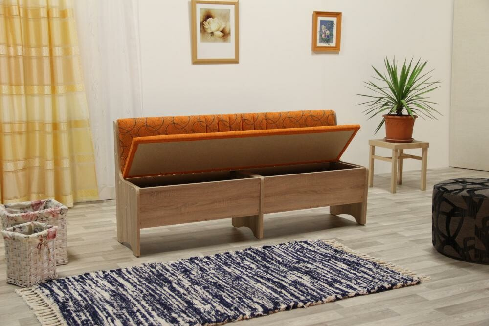 Kostra jídelní lavice je tvořena kombinací masivu a velkoplošných materiálů. Čalounění je tvořeno PUR pěnou. Povrch úložného prostoru a nohy jsou vyrobeny z lamina.