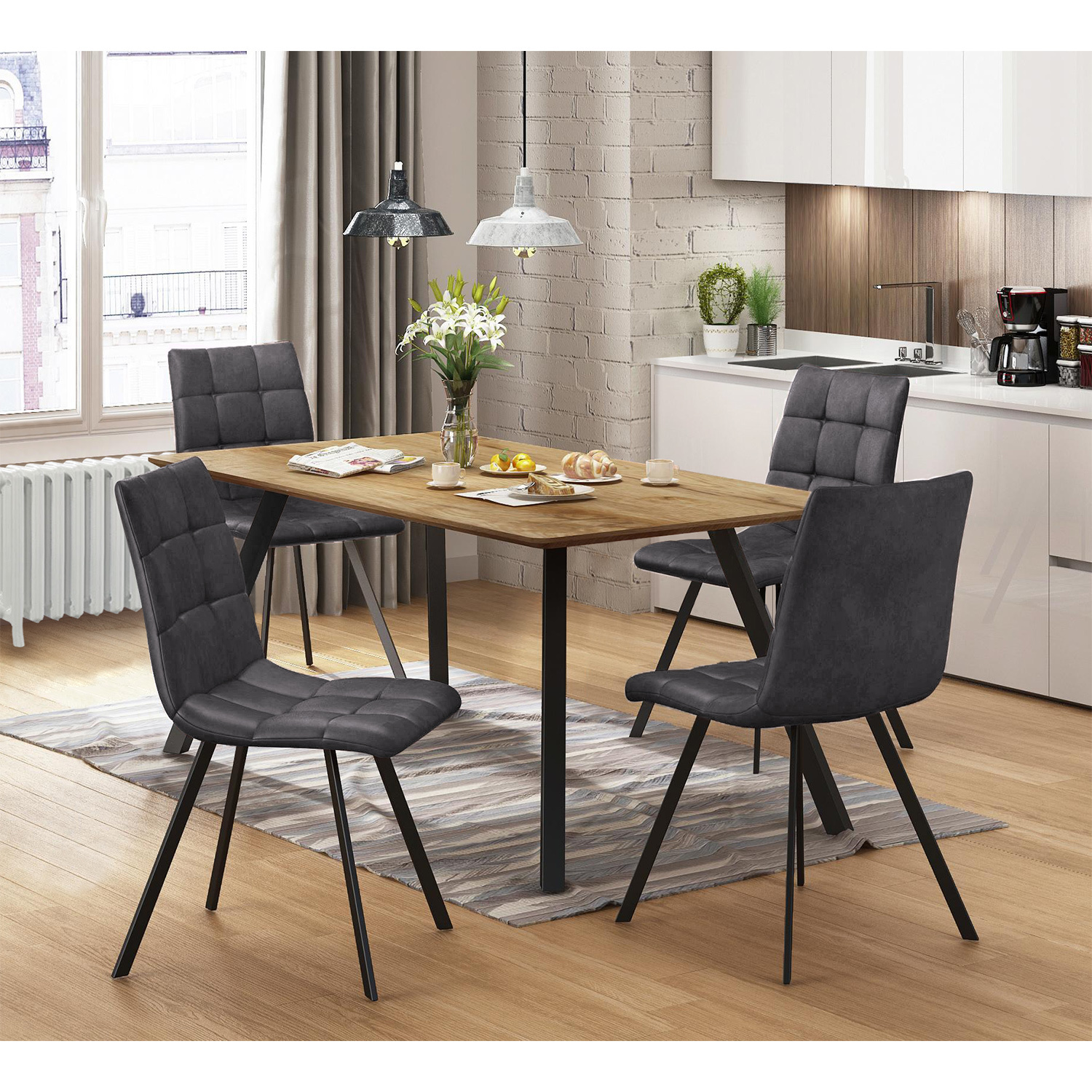 Stylový jídelní set se skládá ze 4 židlí a stolu Bergen obdélníkového tvaru. Obdélníkový stůl je zhotoven v pevném, nerozkládacím provedení se stolovou deskou z MDF v barevném provedení dub Wotan. Konstrukce stolu je kovová v černé barvě. Židle jsou vyrobeny z kovové konstrukce v černé barvě, sedák i opěrák jsou potaženy broušenou kůží - imitace mikrovlákno, v dezénu šedém. Luxusně působící jídelní set Bergen vám poslouží při každodenním stolování. Zboží dodáváme v demontu.