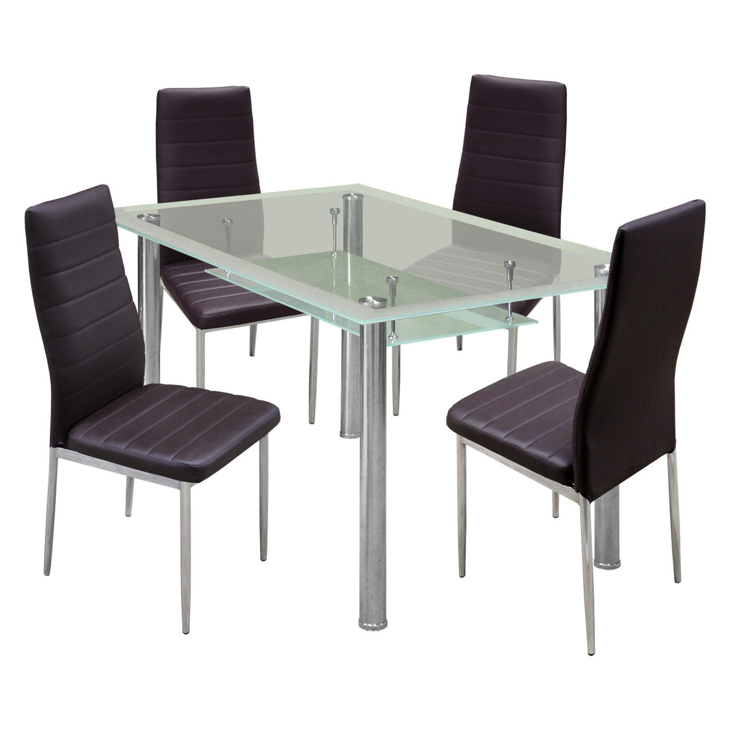 Moderní jídelní set VENEZIA se stolem a 4 jídelními židlemi od značky MILÁNO, které do Vaší velké jídelny jistě skvěle umístíte. Materiály jsme vybírali pečlivě a nakonec jsme zvolili kov a tvrzené sklo. Stůl má šikovnou polici s matným sklem, na kterou vidíte skrz nápaditě řešenou desku s matnými okraji. Na židlích naleznete chromované nohy s potahem imitace kůže v barevném provedení moderní hnědá. V případě potřeby lze pořídit i větší počet židlí, židle MILÁNO 3010 jsou totiž k dostání i samostatně. Zboží dodáváme v demontu.