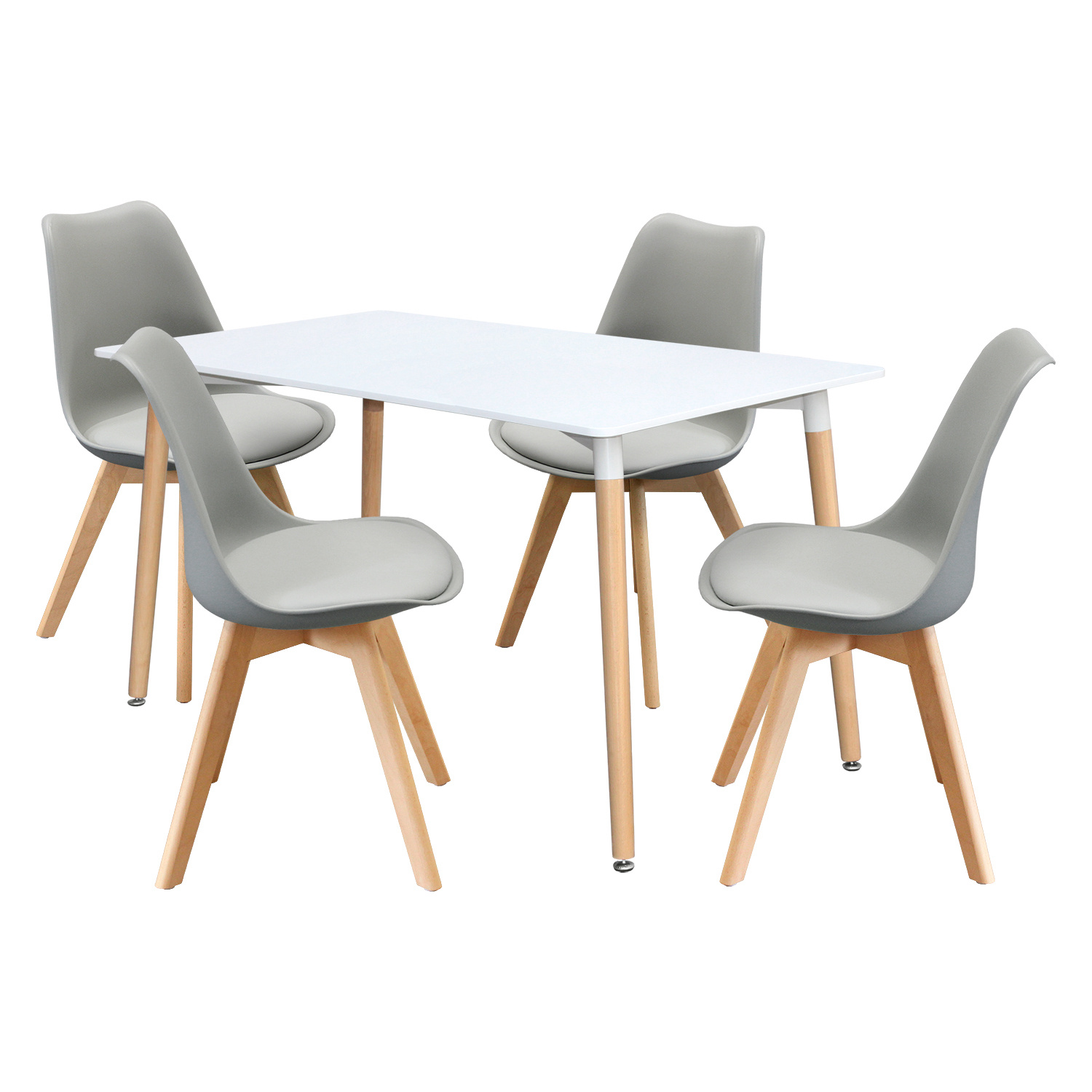 jídelní stůl 3152 a 4 jídelní židle 3149 rozměr stolu (š/h/v): 140 × 90 × 74 cm deska MDF, barevné provedení bílá kovová konstrukce, barevné provedení bílá kulaté nohy, materiál masiv buk nastavitelné plastové kluzáky s pochromovanou krytkou korpus PP, sedák kůže – imitace, barevné provedení šedá nohy masiv buk, výška sedu 46 cm rozměr židle (š/h/v): 49 × 54 × 83 cm