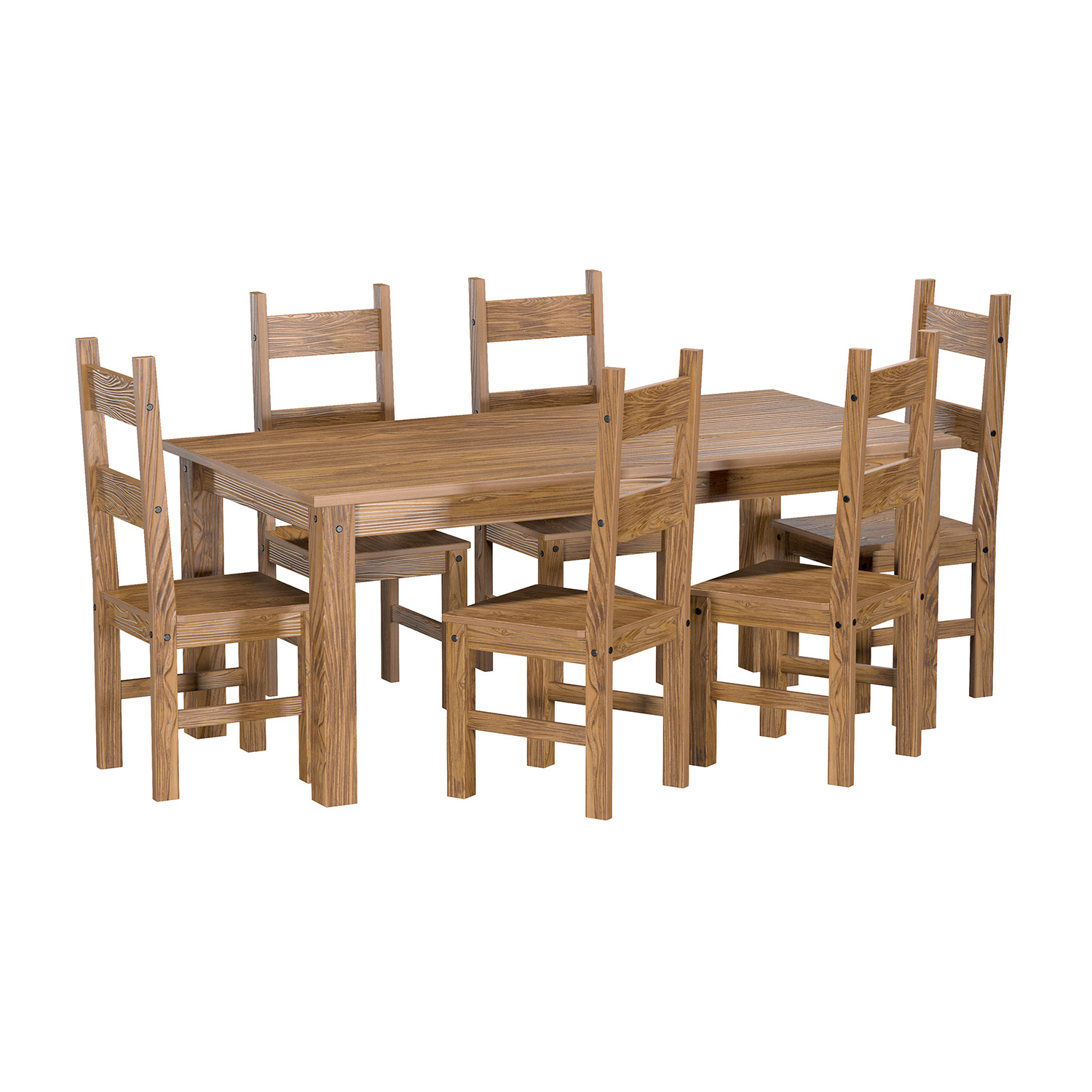 jidelní stůl 26813 a 6 jídelních židlí 26821 stůl i židle materiál masiv borovice, barevné provedení dub antik lakováno čirým lakem, vlis dřevěné struktury rozměr stolu (š/h/v) 178 × 92 × 76 cm rozměr židle (š/h/v) 43 × 49 × 107 cm součást sestavy EL DORADO