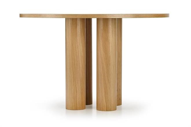 Jídelní stůl je vyroben z MDF desky potažené přírodní dýhou z dubu, což mu dodává pevnost a odolnost. Dýha je navíc ošetřena speciálním lakem, který chrání povrch před poškrábáním a vlhkostí. Stůl má kulatou desku o průměru 120 cm, která nabízí dostatek prostoru pro pohodlné stravování až čtyř osob. Podnož stolu je tvořena čtyřmi nohami z masivního dubu. Židle K502 nejsou součástí stolu.