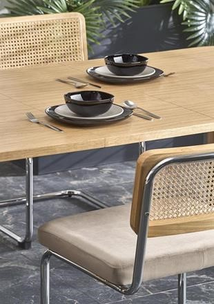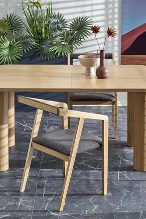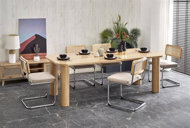 Jídelní stůl je vyroben z MDF desky potažené přírodní dýhou z dubu, což mu dodává pevnost a odolnost. Dýha je navíc ošetřena speciálním lakem, který chrání povrch před poškrábáním a vlhkostí. Nohy stolu tvoří čtyři nohy z masivního dubu. Židle nejsou součástí stolu.