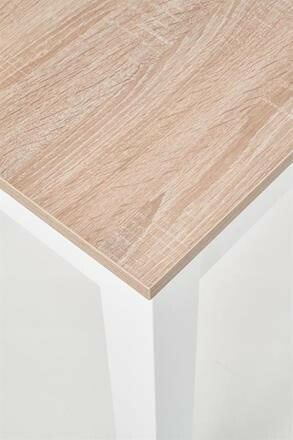 Jídelní stůl je vyroben z materiálu MDF lamino v barevném dezénu dub sonoma a nohy jsou ze stejného materiálu v barevném provedení bílá. Jídelní židle nejsou součástí produktu. Maximální nosnost 40 kg. Zboží je dodáváno v demontu.