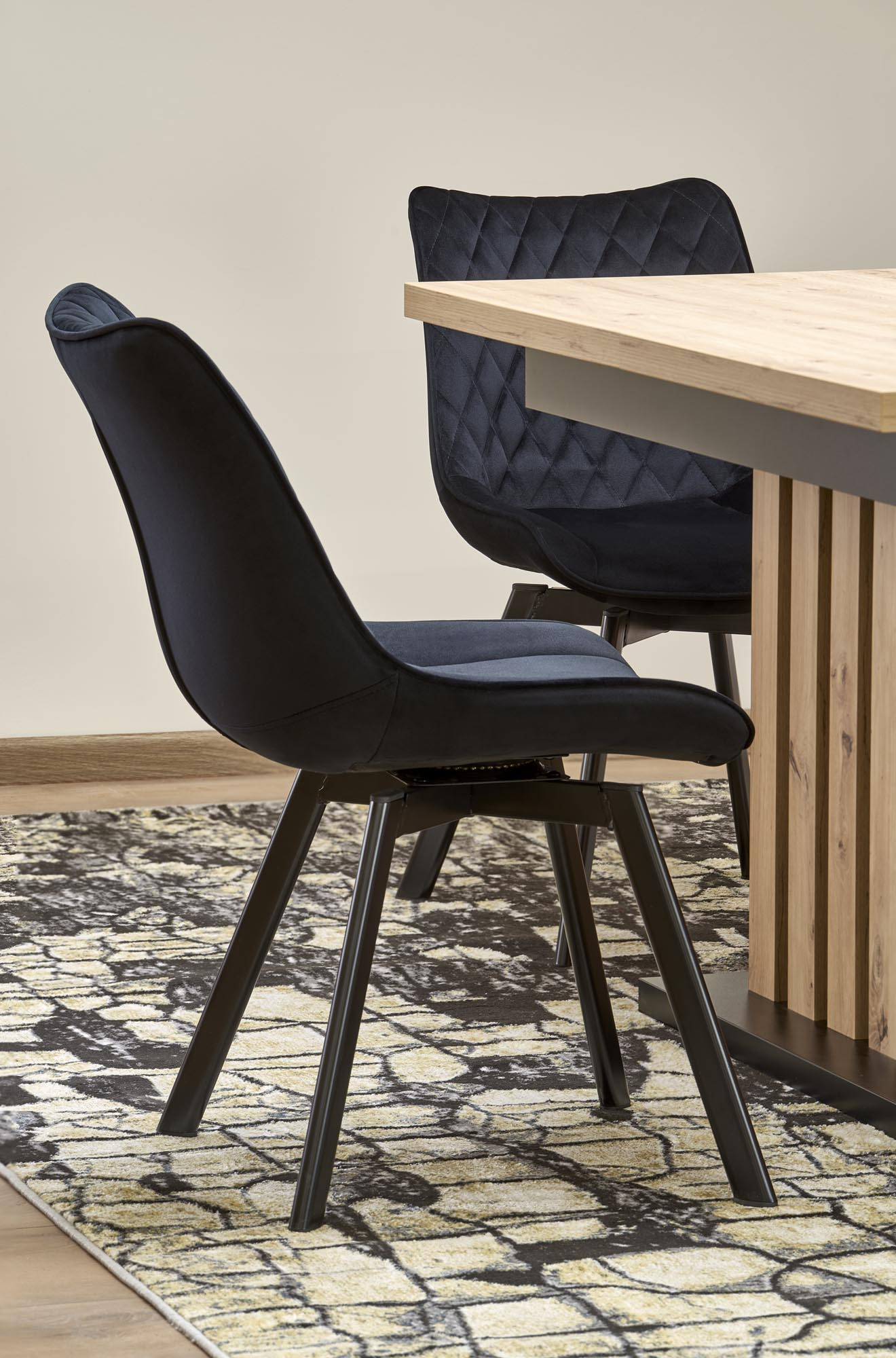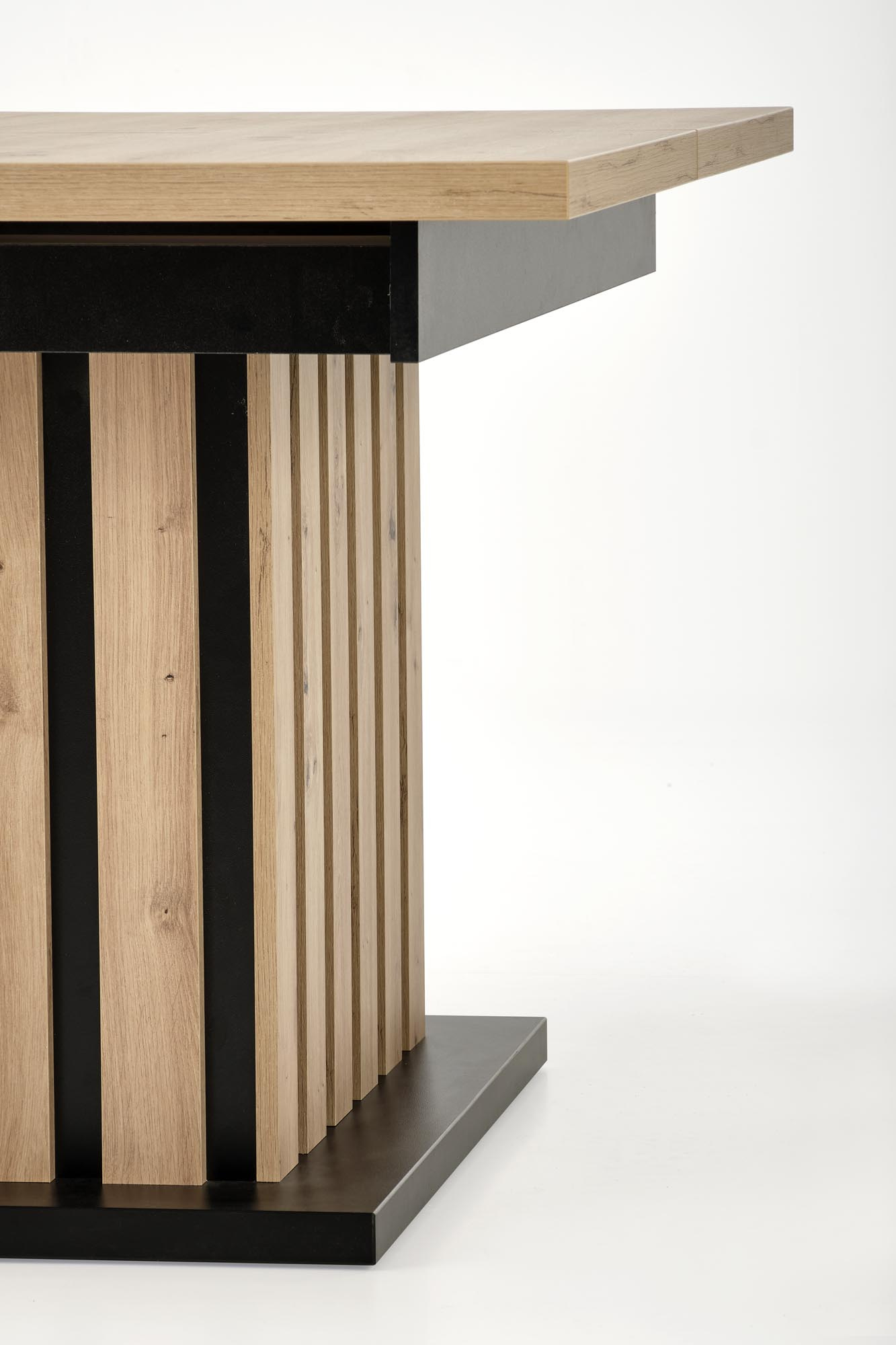 Rozkládací jídelní stůl Lamello má desku z odolné laminované MDF desky v barvě dub artisan. Nohy jsou v barevné kombinaci dub artisan/ černá. Zboží dodáváme v demontu.