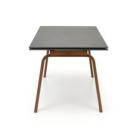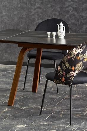 Stůl LOZANO je vyroben z kvalitní sintrované práškově lakované oceli, což zajišťuje jeho dlouhou životnost a snadnou údržbu. Vrchní deska je vyrobená z kvalitního černého mramoru a nohy mají ořechovou barvu, což zajišťuje skvělý kontrast a elegantní vzhled. Jídelní židle nejsou součástí.