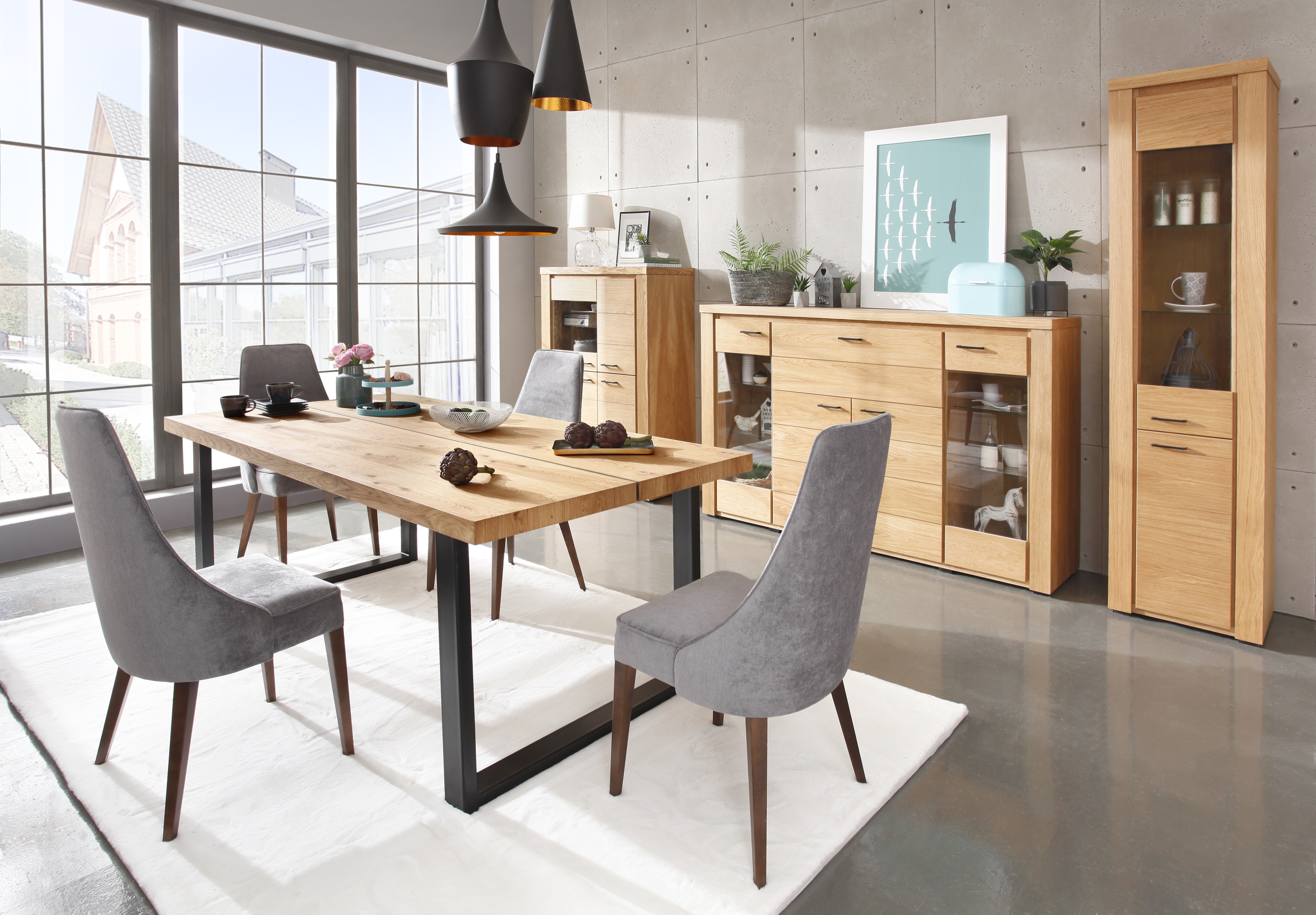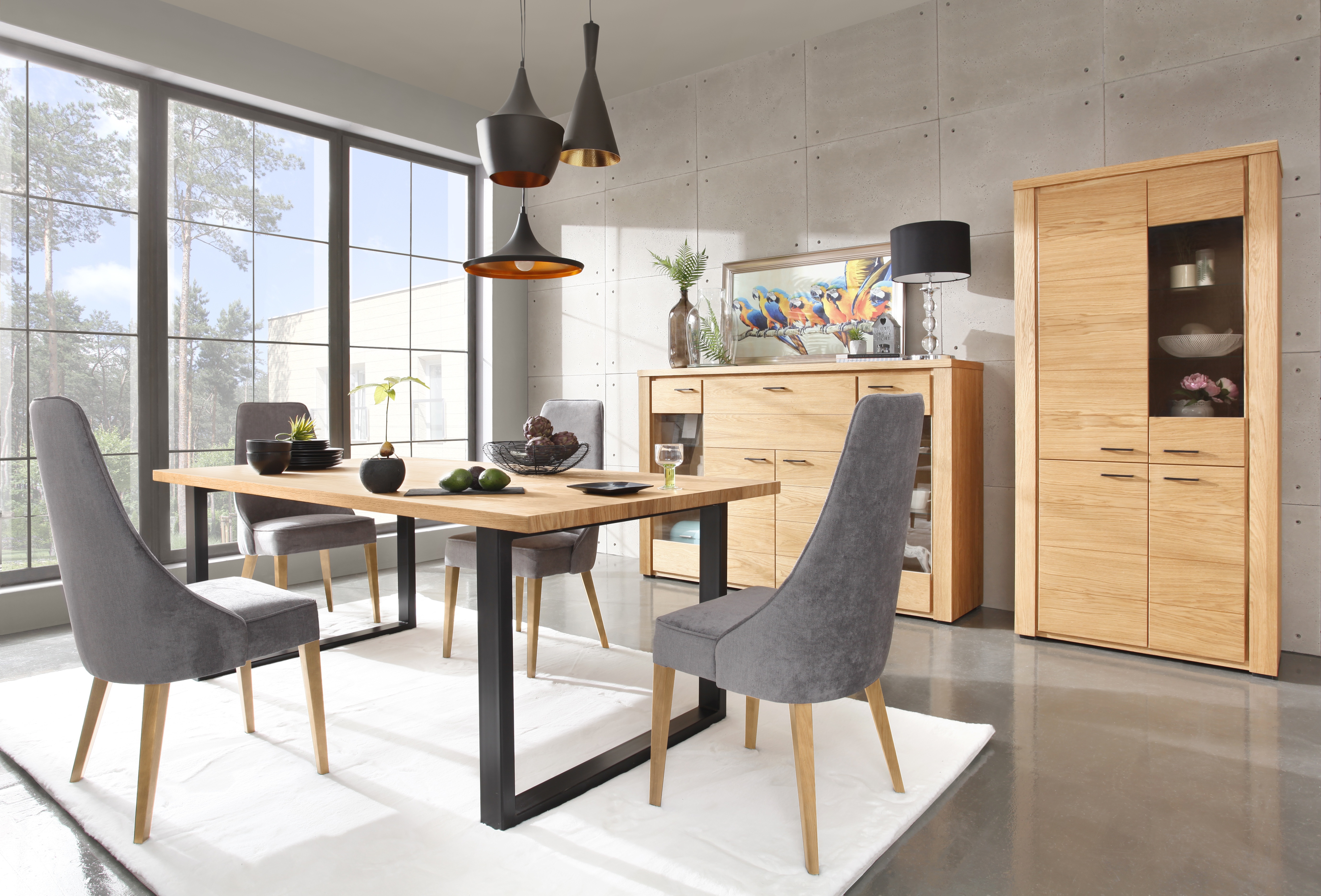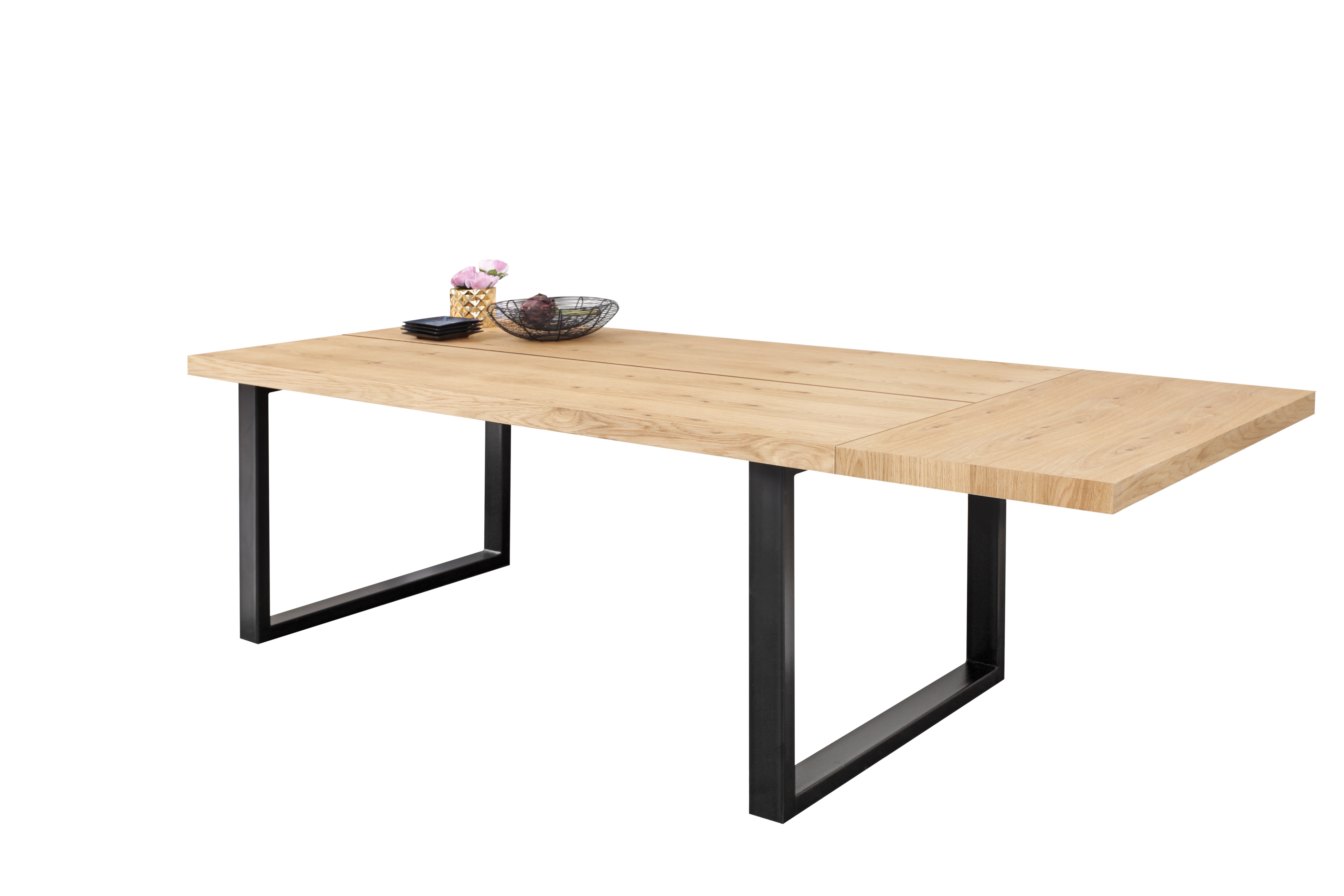 Jídelní stůl má desku stolu vyrobenou z dýhy ošetřené přírodním olejem, nohy prášková ocel. Možnost vložení maximálně dvou vkladů  50/90 cm. Možnost výběru z několika odstínů moření dřeva. Stůl vhodný k systému NATURA.