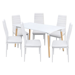 jídelní stůl ONE 3153 a 4 jídelní židle SIGMA 3164 stůl: deska MDF, barevné provedení bílá kovová konstrukce, barevné provedení bílá kulaté nohy, materiál masiv buk židle: potah kůže – imitace, barevné provedení bílá kovové nohy a konstrukce, výška sedu židle 47 cm rozměr stolu (š/h/v) 160 × 90 × 74 cm rozměr židle (š/h/v) 42 × 41 × 98 cm