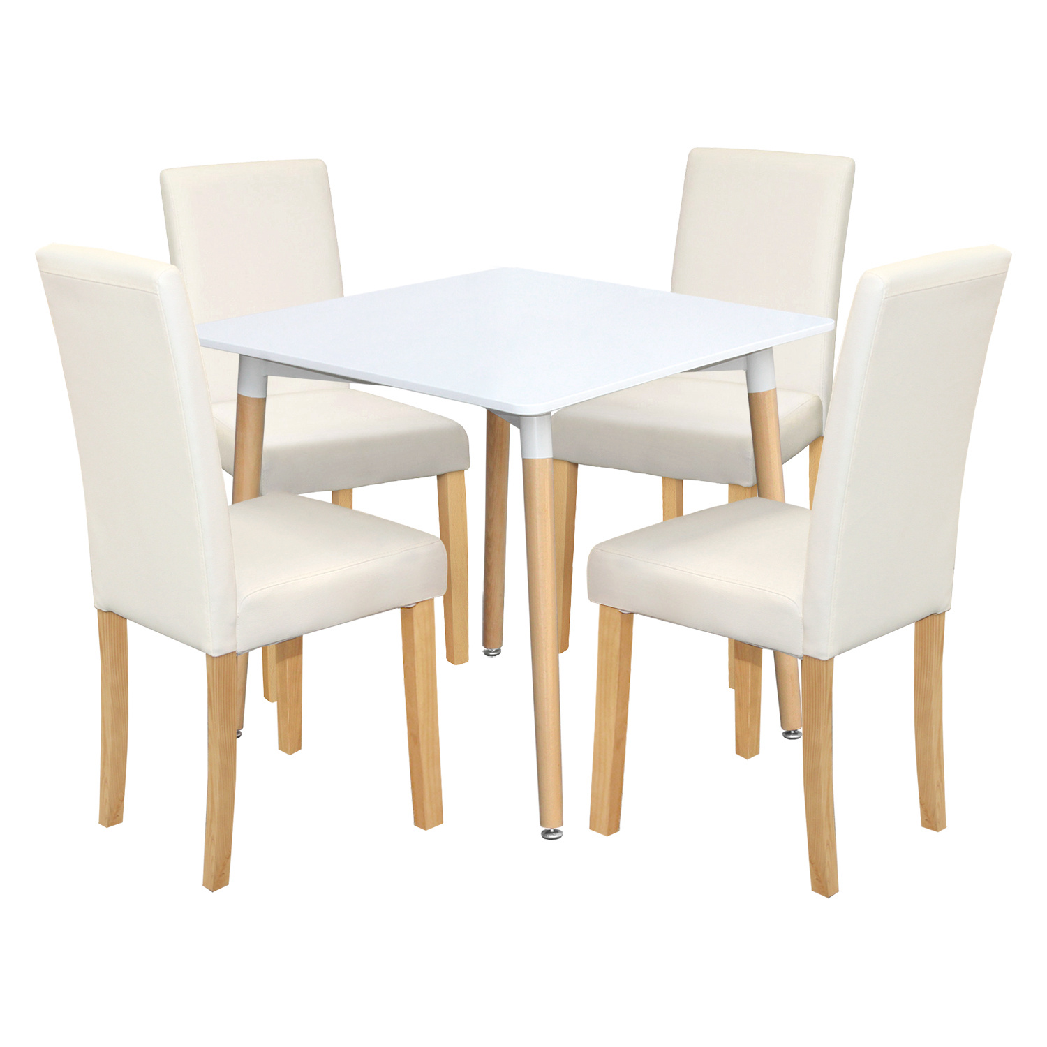 jídelní stůl ONE 3150 a 4 jídelní židle PRIMA 3037 stůl: deska MDF, barevné provedení bílá kovová konstrukce, barevné provedení bílá kulaté nohy, materiál masiv buk židle: potah kůže – imitace, barevné provedení bílá nohy masiv čirý lak, výška sedu 47 cm rozměr stolu (š/h/v) 80 × 80 × 74 cm rozměr židle (š/h/v) 45 × 55 × 90 cm
