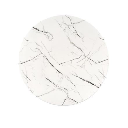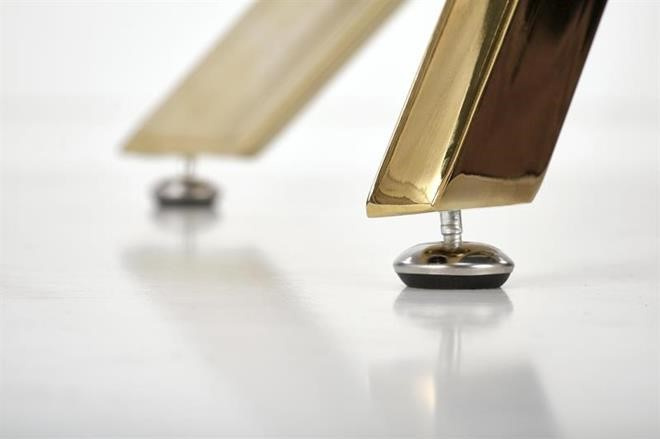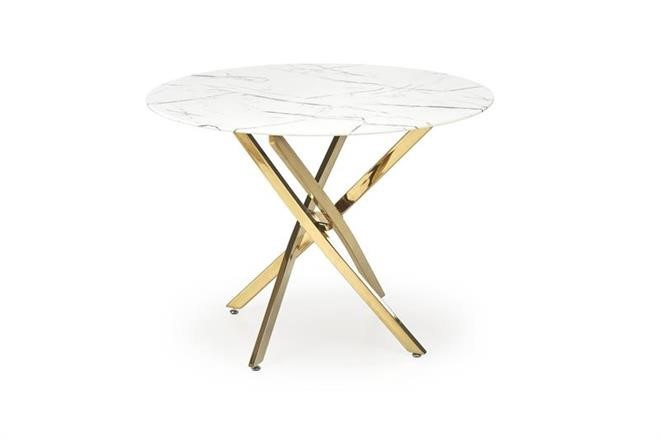Jídelní stůl si oblíbíte pro jeho kulatý design a zajímavou konstrukci. Tento jídelní stůl se hodí do domácností, kaváren, restaurací, ale jistě jej oceníte rovněž v hotelech. Deska stolu se vyrábí z skla v barvě bílý mramor a nese ji zajímavě propletená konstrukce z chromované oceli ve zlaté barvě. Obohaťte svou jídelnu či kuchyň o tento moderní jídelní stůl. Židle nejsou součástí produktu. Zboží dodáváme v demontu.